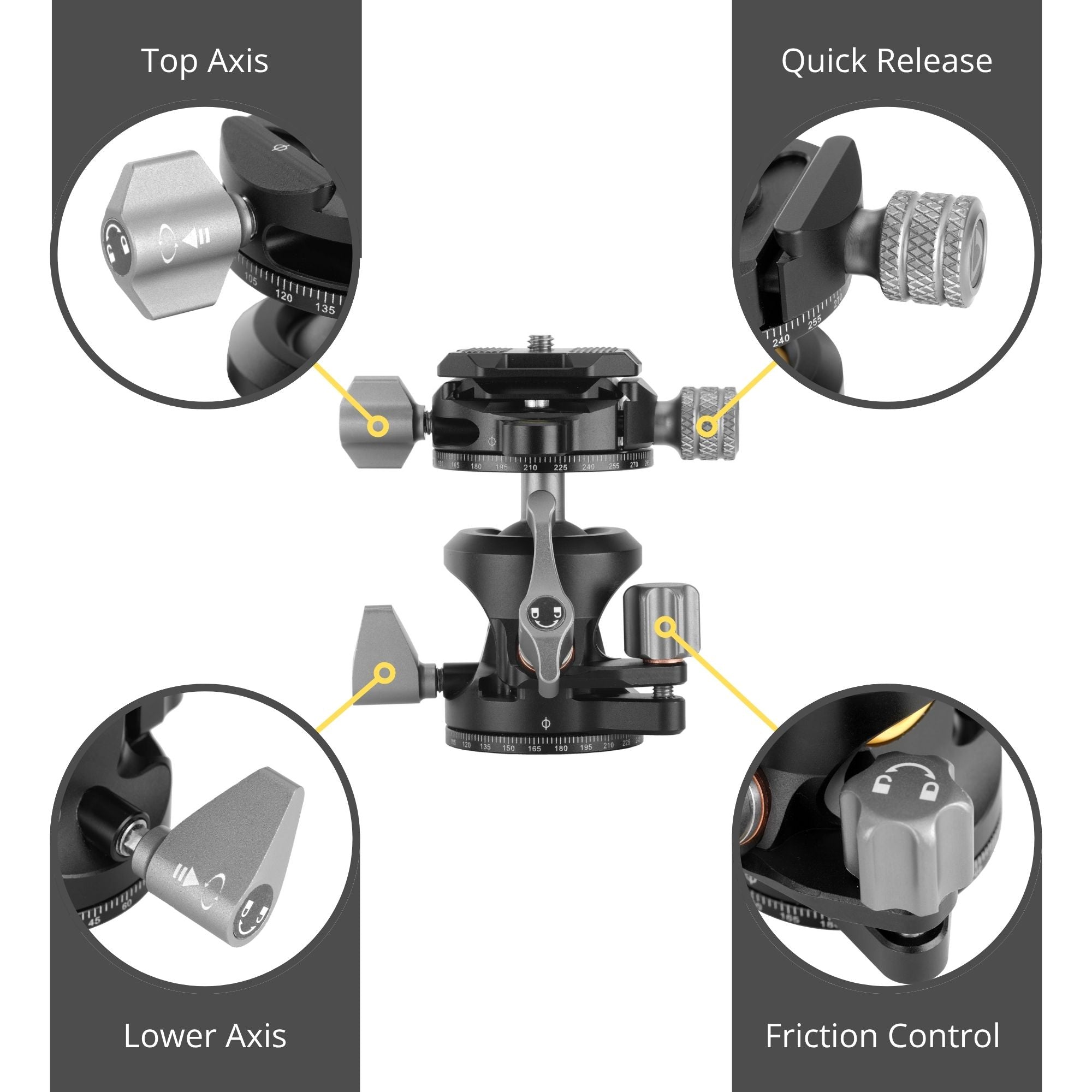 Easy grip locking knobs can be tightened and released with ease, even in cold and wet conditions. On a smaller head, sometimes the setup can mean that the locking knobs can get in the way of each other. To address this, the top axis locking knob and the main ball locking knob can also be pulled outwards and repositioned to more convenient and comfortable positions without affecting the solidity of the head.