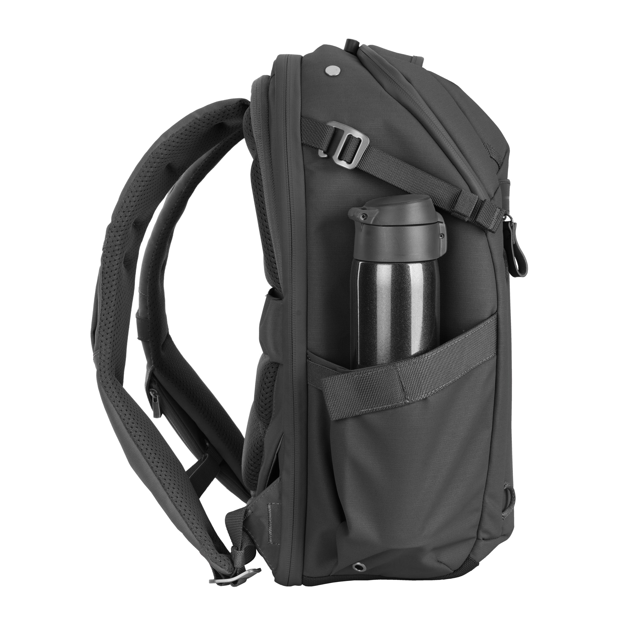 - Fits a 14" laptop, with expanding side pockets for a tripod or water bottle