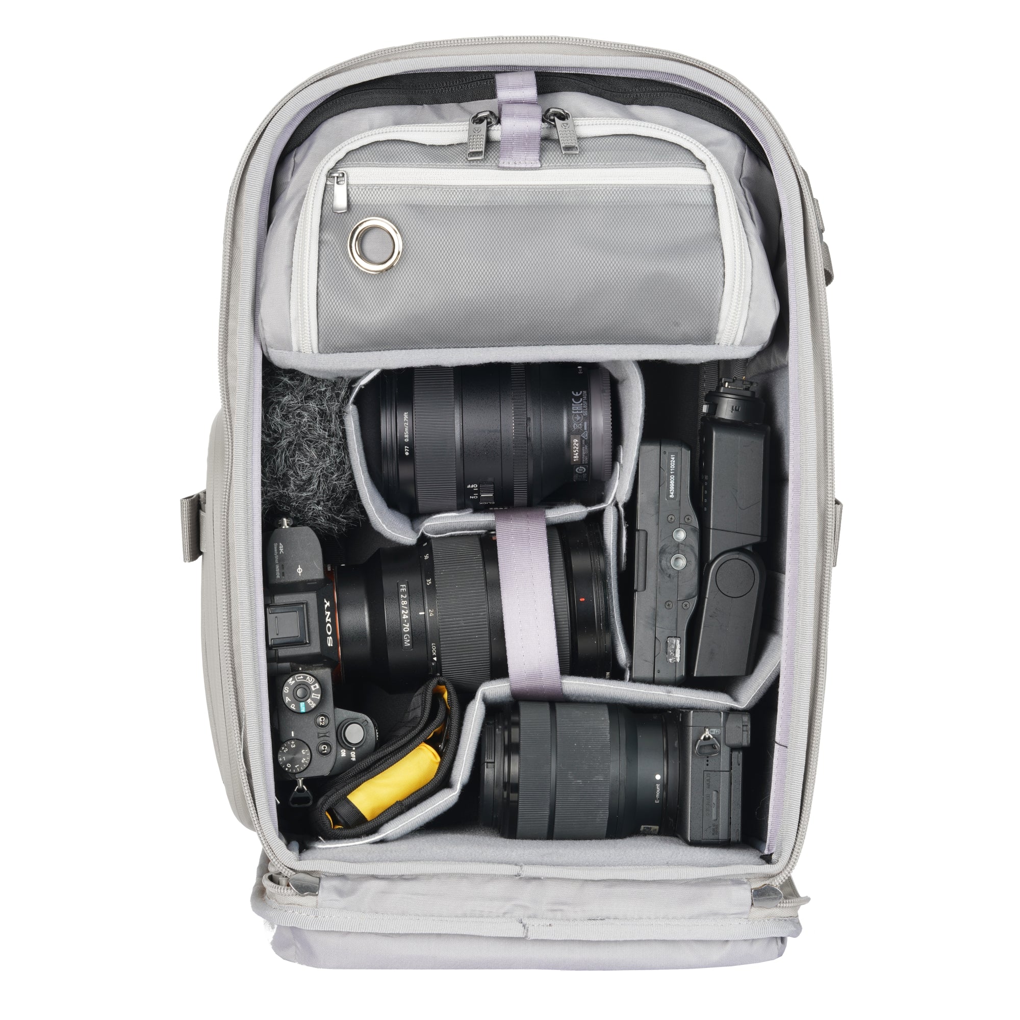 The camera compartment is 260mm wide, by 250mm tall, and between 135-150mm deep depending on the size of the laptop or paperwork that is packed. This allows you to carry a full frame camera with up to 3 lenses (up to 70-200mm f2.8), separated by slimline EVA dividers that are designed to maximise the space available while protecting your kit. These dividers can be adjusted to your preferred layout, or removed altogether to create an everyday backpack. Full access to the camera compartment is through the back for maximum security, with quick top access to your camera so you can be ready to shoot in seconds.