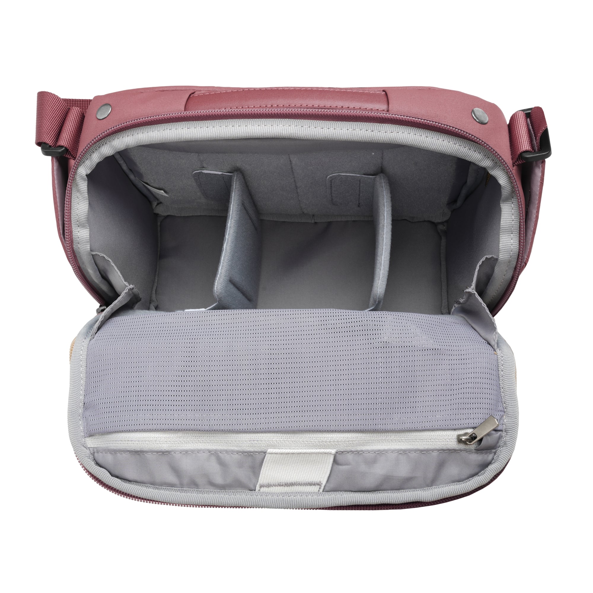 The camera compartment is 230-260mm wide, by 125-150mm tall and 100mm deep. This allows you to carry an APSC camera with up to 2 lenses (up to 28-70mm f3.5-5.6) separated by slimline EVA dividers that are designed to maximise the space available while protecting your kit. These dividers can be adjusted to your preferred layout, or removed altogether to create an everyday shoulder bag. Full access to the camera compartment is through the top of the bag which opens away from the body for maximum security.