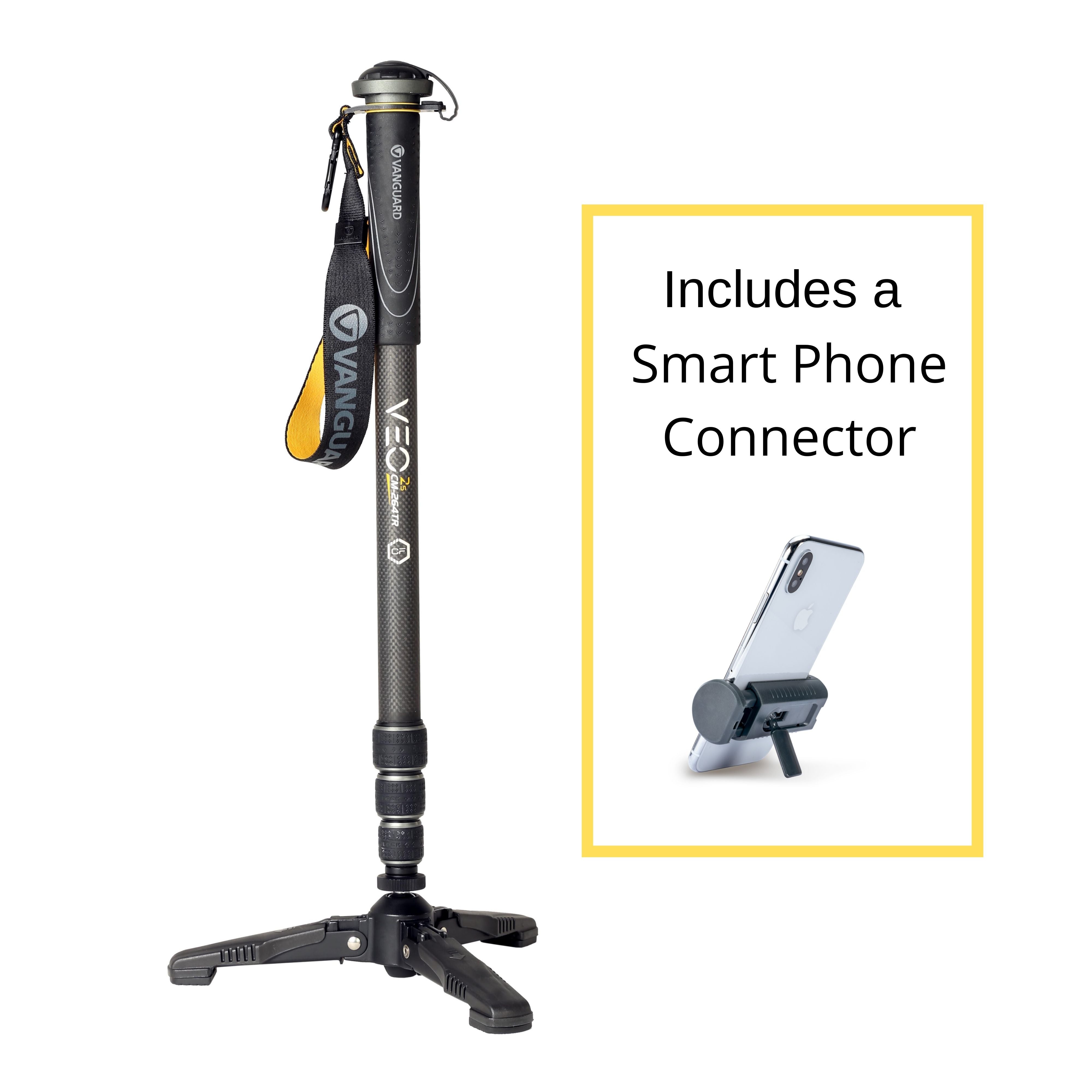 The Vanguard VEO 2S CM-264TR Carbon Fibre Monopod with Tri-Feet and Smartphone Connector Kit is a lightweight, compact, 26mm carbon monopod with foldable feet. Great for shooting photo or video where a tripod isn't practical, but you need better stability than a traditional monopod.