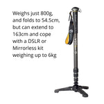The 26mm carbon monopod leg weighs just 800g and can take a maximum load capacity of 15kg, more than enough to cope with all but the largest DSLR or Mirrorless kits.
