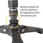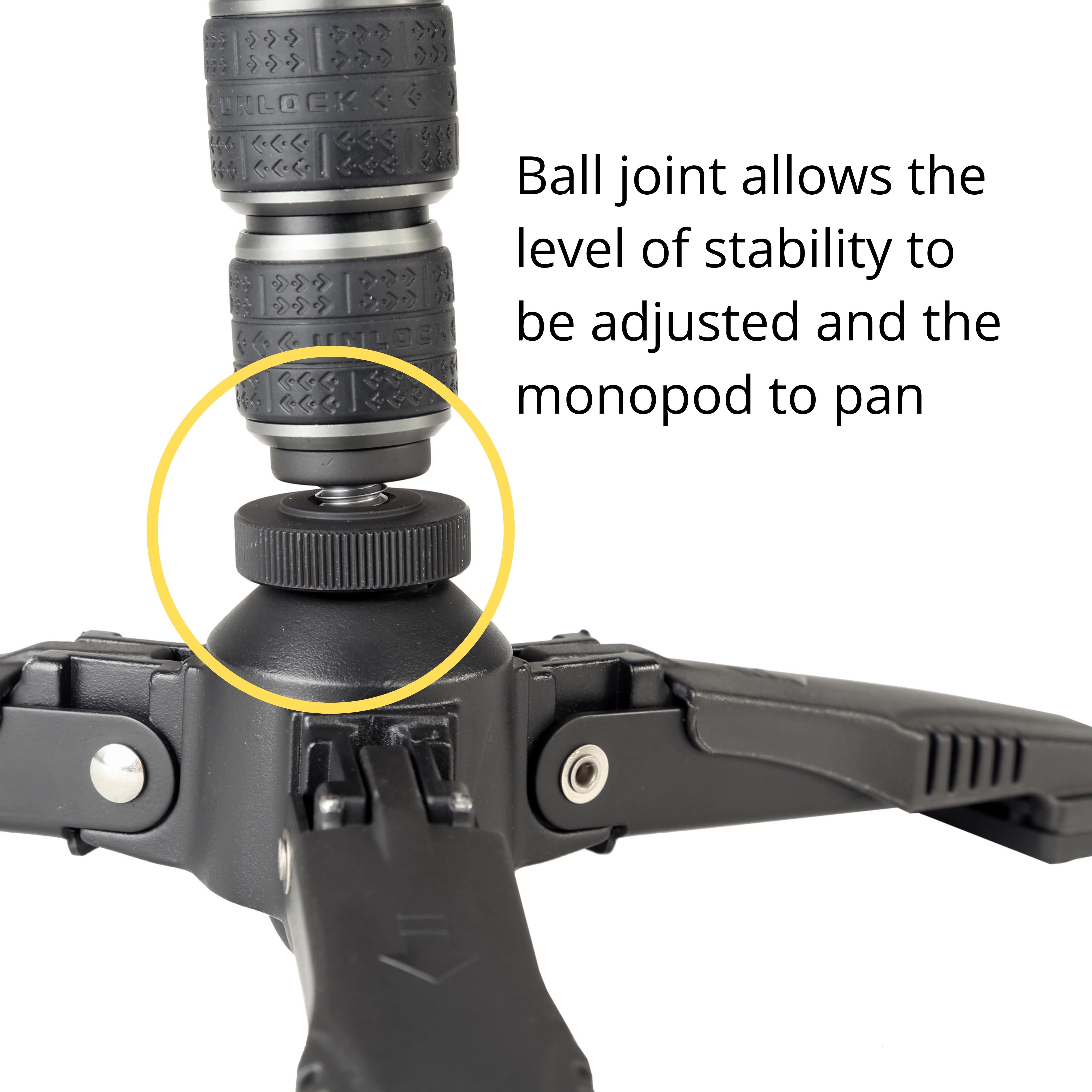 The tri-feet are permanently fixed, but flip up for transporting the monopod, but can be deployed fast with just a finger. The base also includes a ball joint which can be tightened for maximum stability, or loosened to allow more dynamic movement, for example, tracking a moving subject. In addition, the tri-feet allows you to pan using the monopod itself