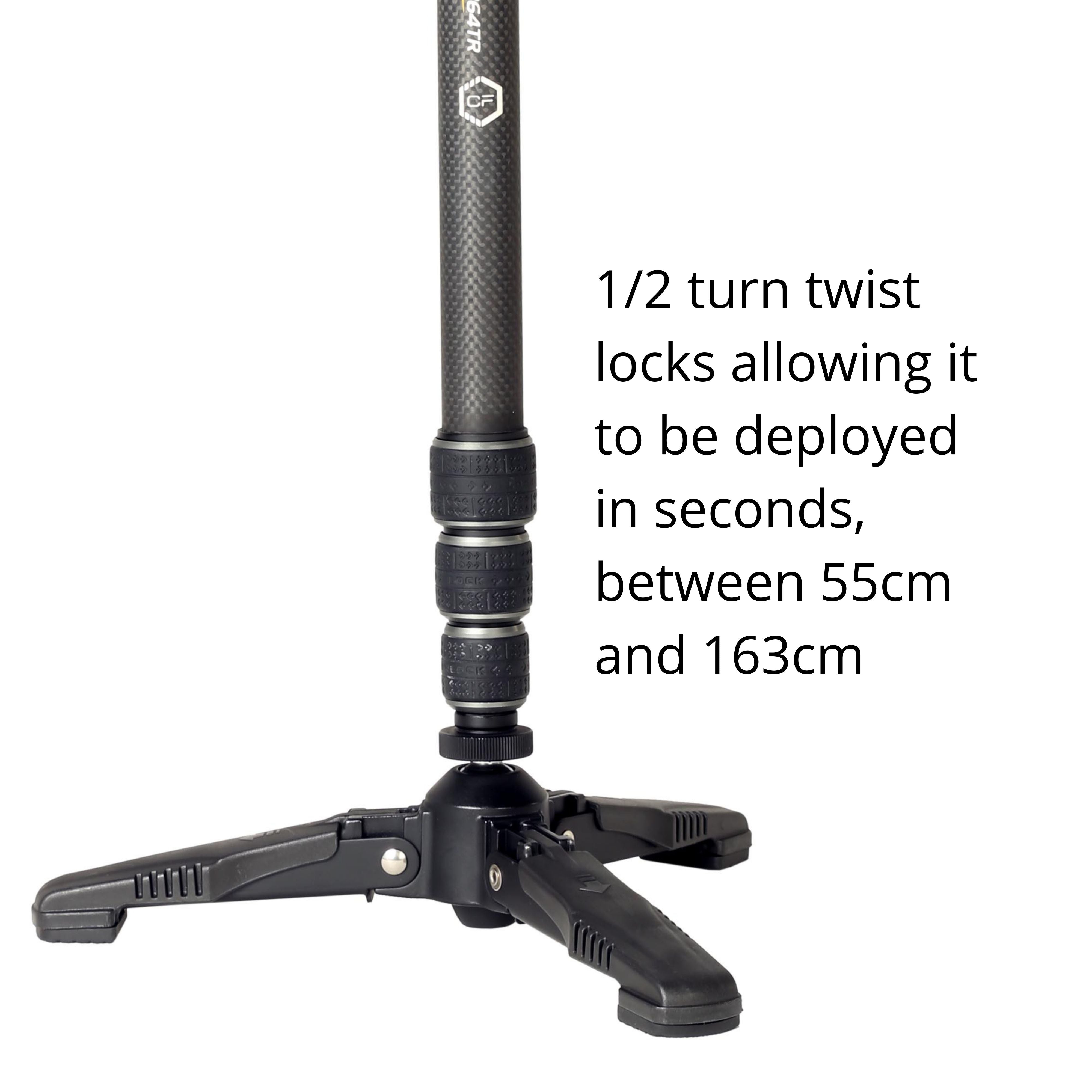 The ½” turn lock/unlock twist leg locks allow set-up in seconds and rapid height adjustments, allowing you to shoot at the level you need for the shot, from 55cm to 163cm.