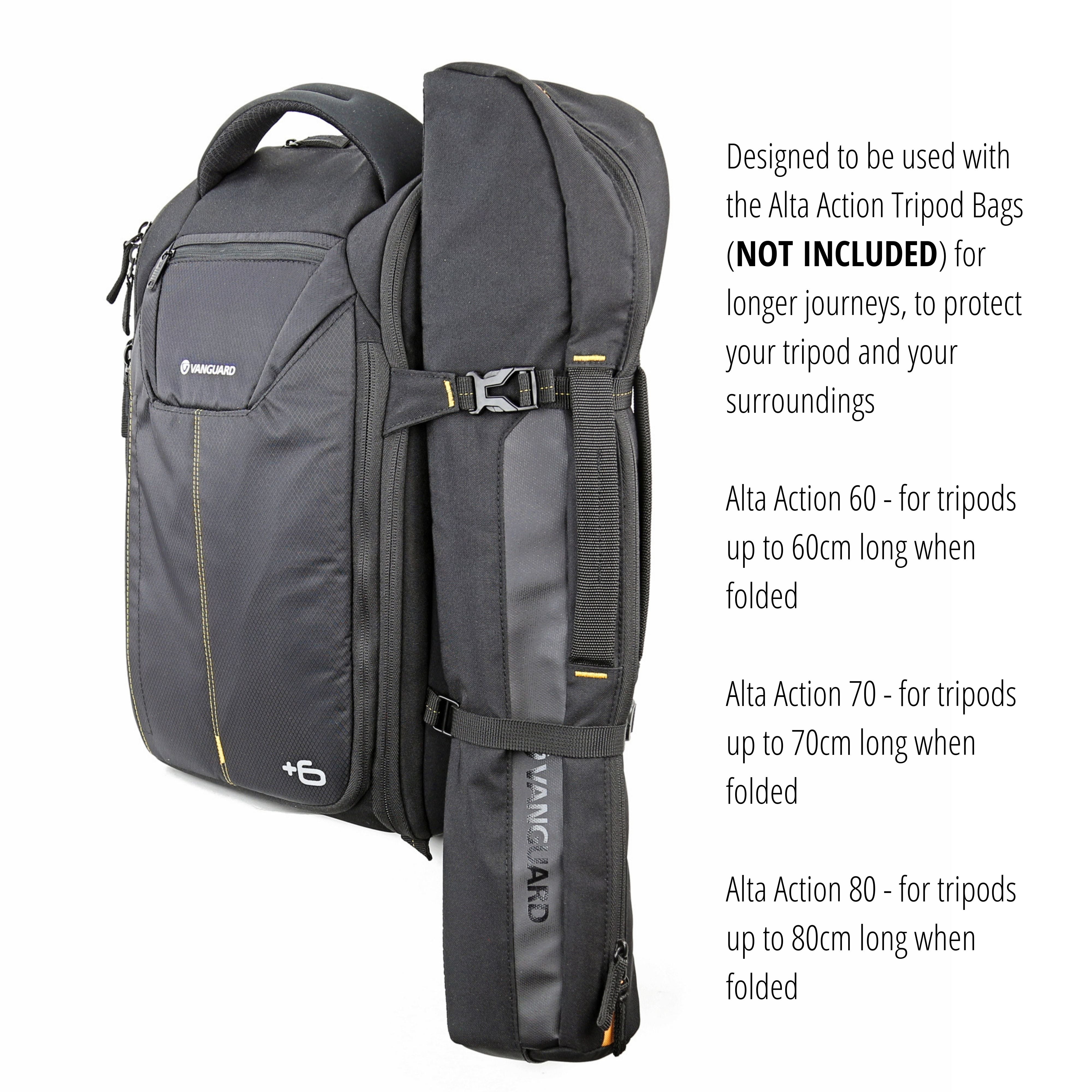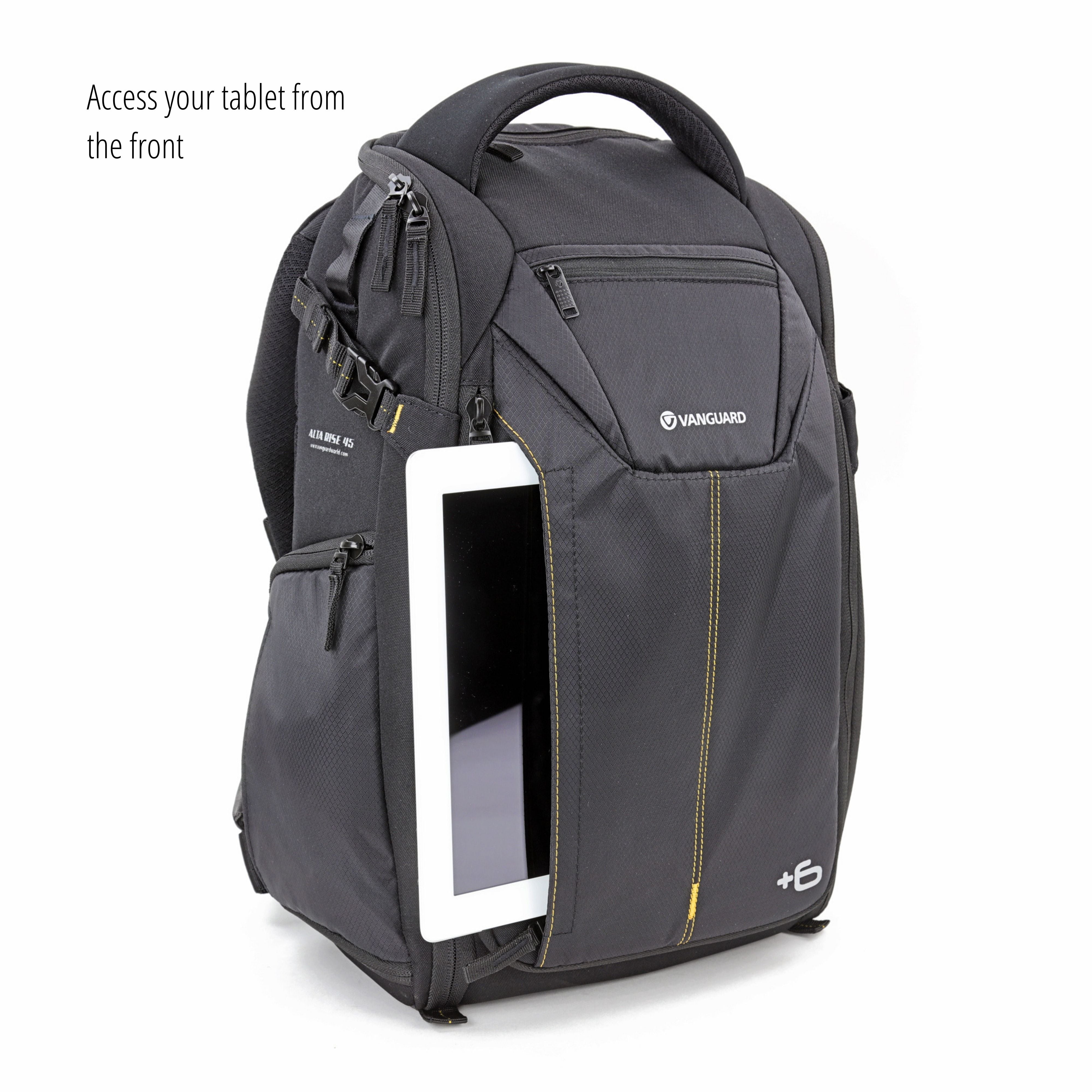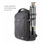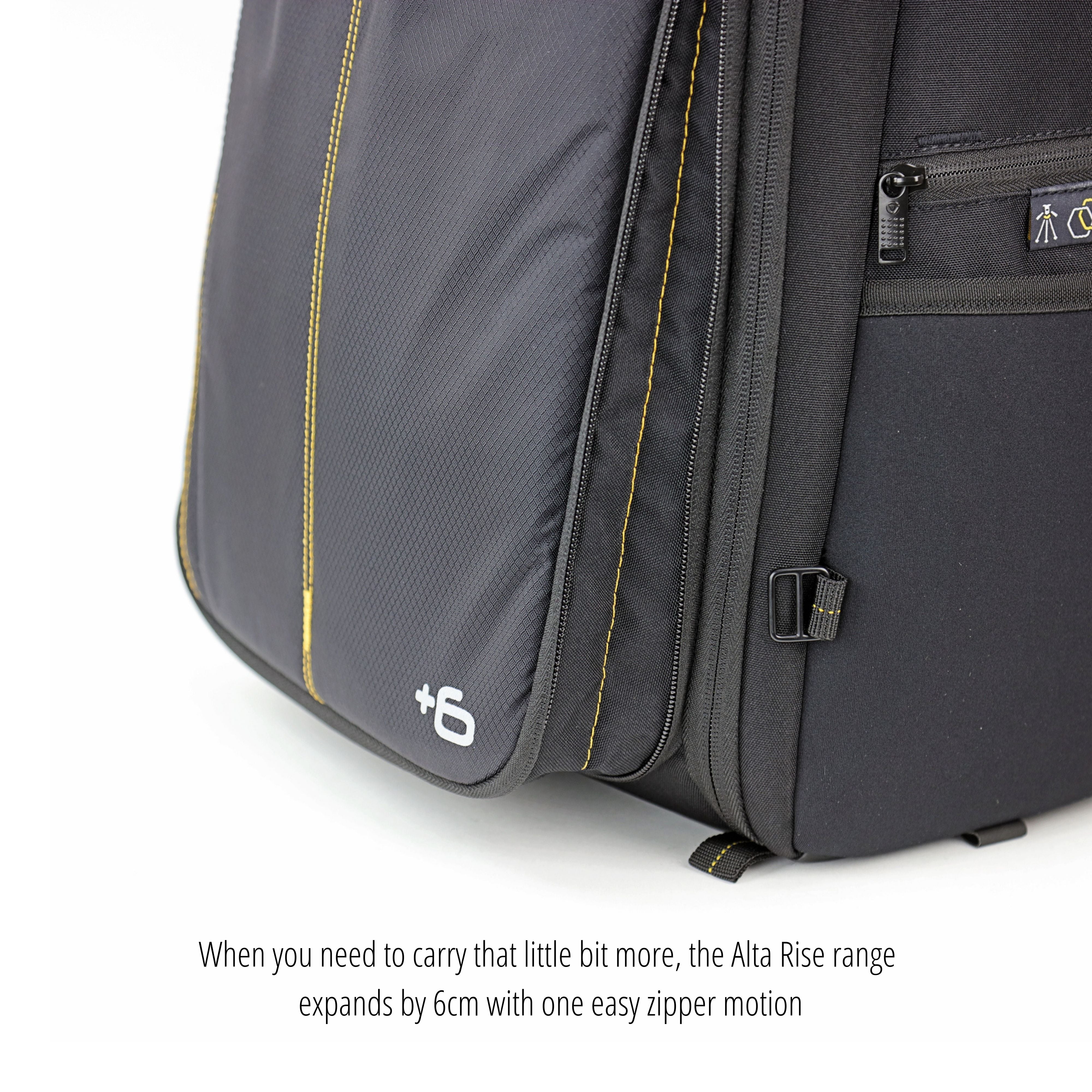 The ALTA RISE 45 is a 20 litre backpack that fits a Pro DSLR, 4-5 lenses (up to 24-70mm f/2.8), a flash, accessories and it carries a tripod. The unique +6 expansion system will allow you to add 6cm storage width with one simple zipper motion, offering storage for laptop or tablet, while still keeping gear protected.