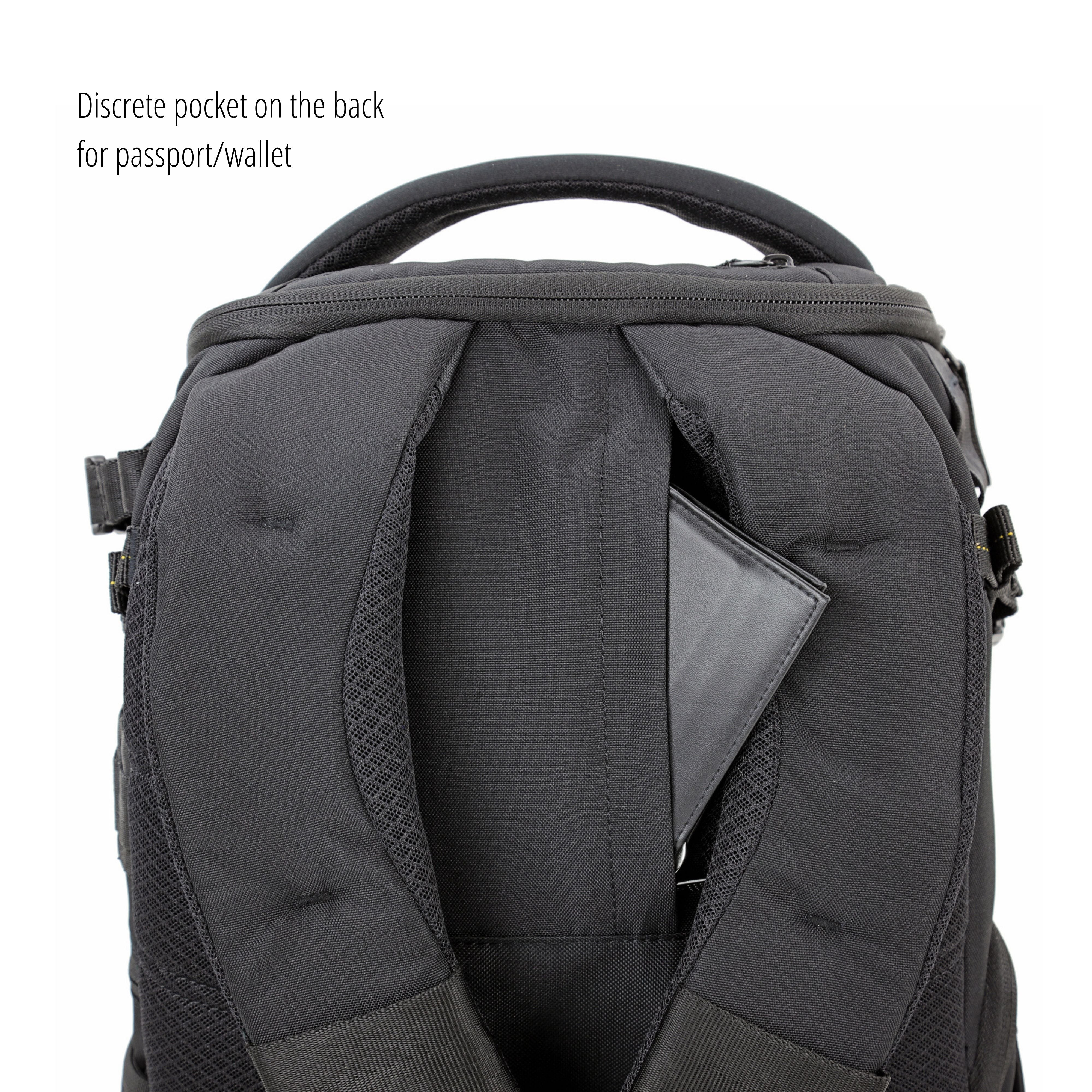 - Concealed pocket on back panel to secure travel document and wallet