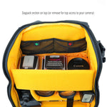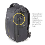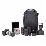 Strategically placed internal and external pockets, arrange all other essentials, such as memory cards, cables, batteries, charger, smartphone and water bottle, exactly where one needs them; either secured in a zippered compartment, or on hand at any given moment in a slip-in pocket. While a concealed rear pocket will secure valuables such as wallet and travel documents close to your body where no prying hands can reach. Additional storage is made possible with the connection to side strap loop. Enhancing performance, you will discover our second-to-none quality, materials and bag construction, our signature total coverage rain cover and our optimal balance tripod carrying system.