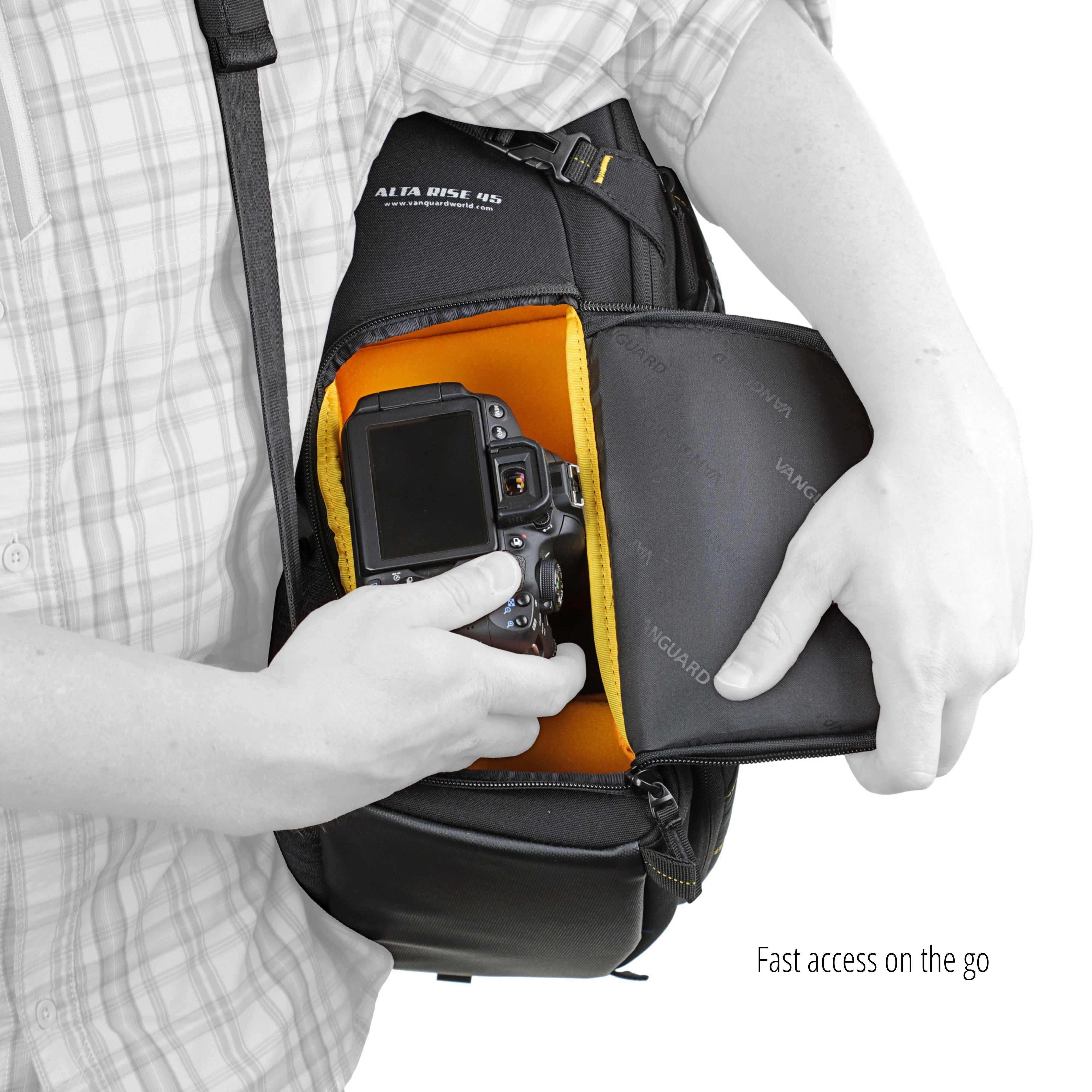 The ALTA RISE 45 backpack with the +6 revolution offers you the possibility to supersize, or downsize, with one easy zipper motion, while still keeping gear protected. So when more gear or personal storage is called for, there is no need to switch bags. Designed for intuitive use, you will find that the quick-action, side flap opening allows you grab-and-shoot in split seconds when releasing one shoulder strap and swinging the backpack around.