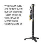 The 23mm aluminium monopod leg weighs just 805g and can take a maximum load capacity of 10kg, more than enough to cope with all but the largest DSLR or Mirrorless kits.