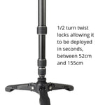 The ½” turn lock/unlock twist leg locks allow set-up in seconds and rapid height adjustments, allowing you to shoot at the level you need for the shot, from 52cm to 155cm.