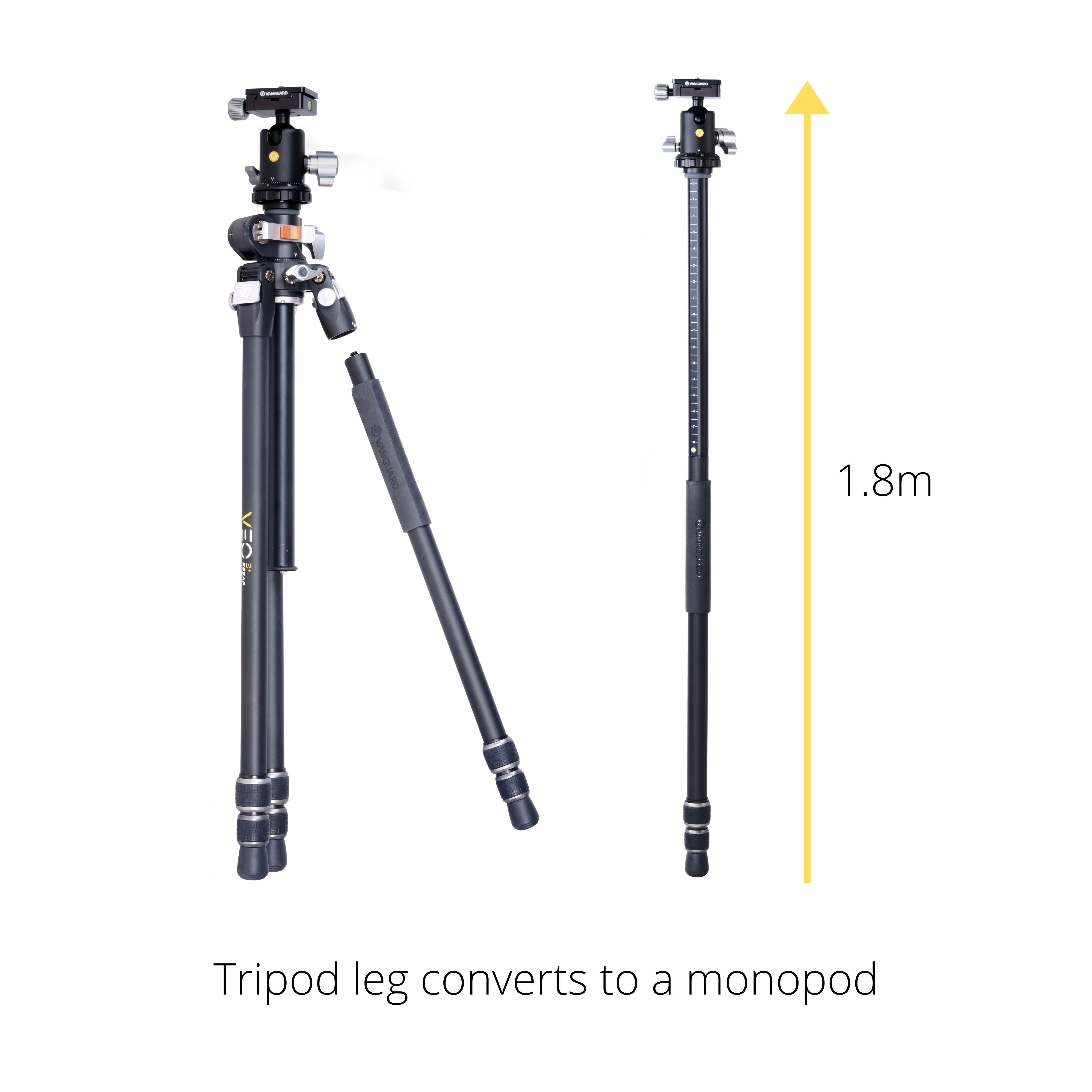 This tripod also features a leg that can be unscrewed to convert into a monopod. Simply remove the leg and the central column, and screw the two together and you have a monopod that extends to 1840mm.