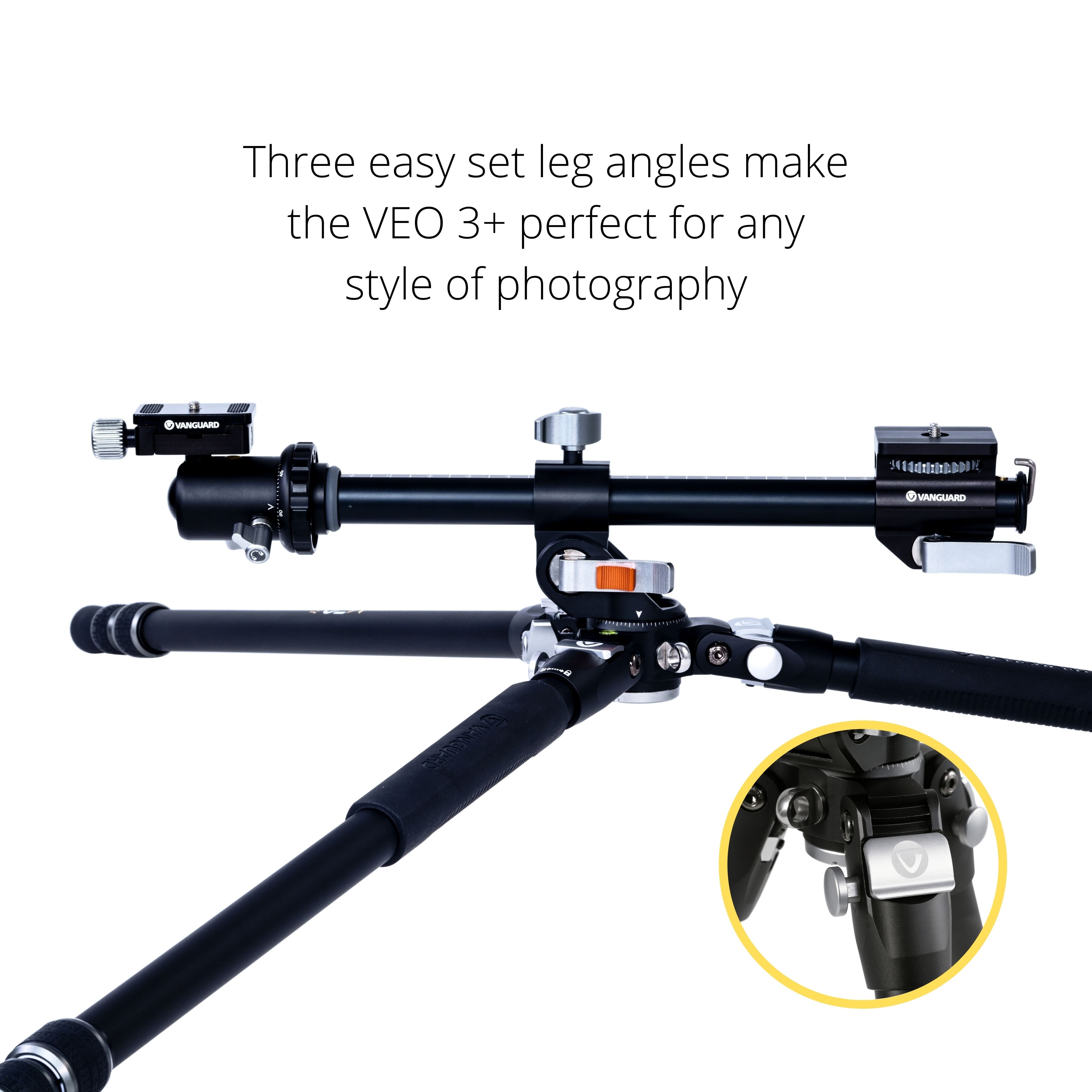 All VEO 3+ tripods come with a market leading Multi-Angle Central Column (MACC) that can be moved almost 360° in any direction with ease. Combined with the three easy set leg angles, it makes the VEO 3+ perfect for any style of photography - moving from macro shots with your lens at ground level, to upright landscape shots in seconds.