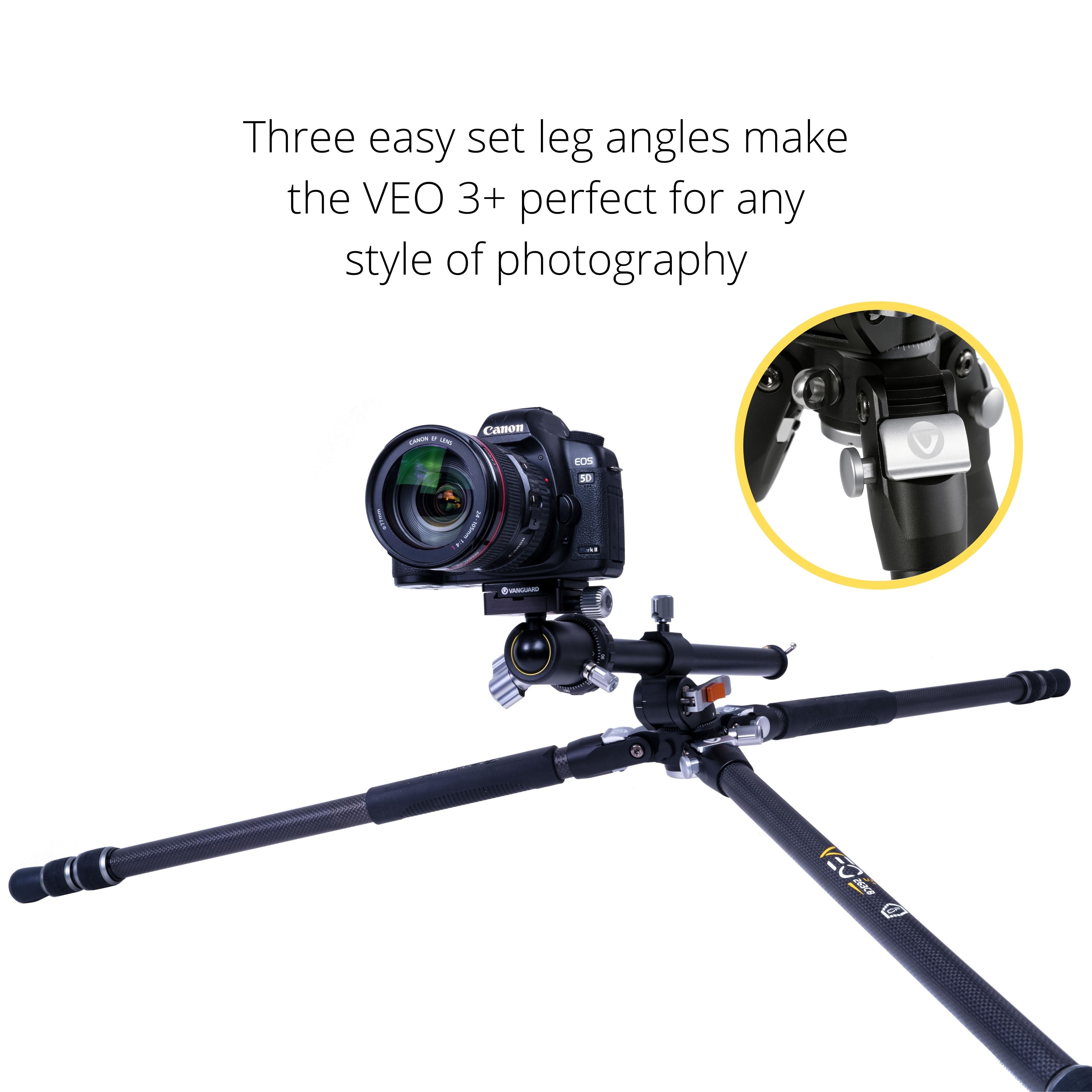All VEO 3+ tripods come with a market leading Multi-Angle Central Column (MACC) that can be moved almost 360° in any direction with ease. Combined with the three easy set leg angles, it makes the VEO 3+ perfect for any style of photography - moving from macro shots with your lens at ground level, to upright landscape shots in seconds.