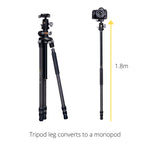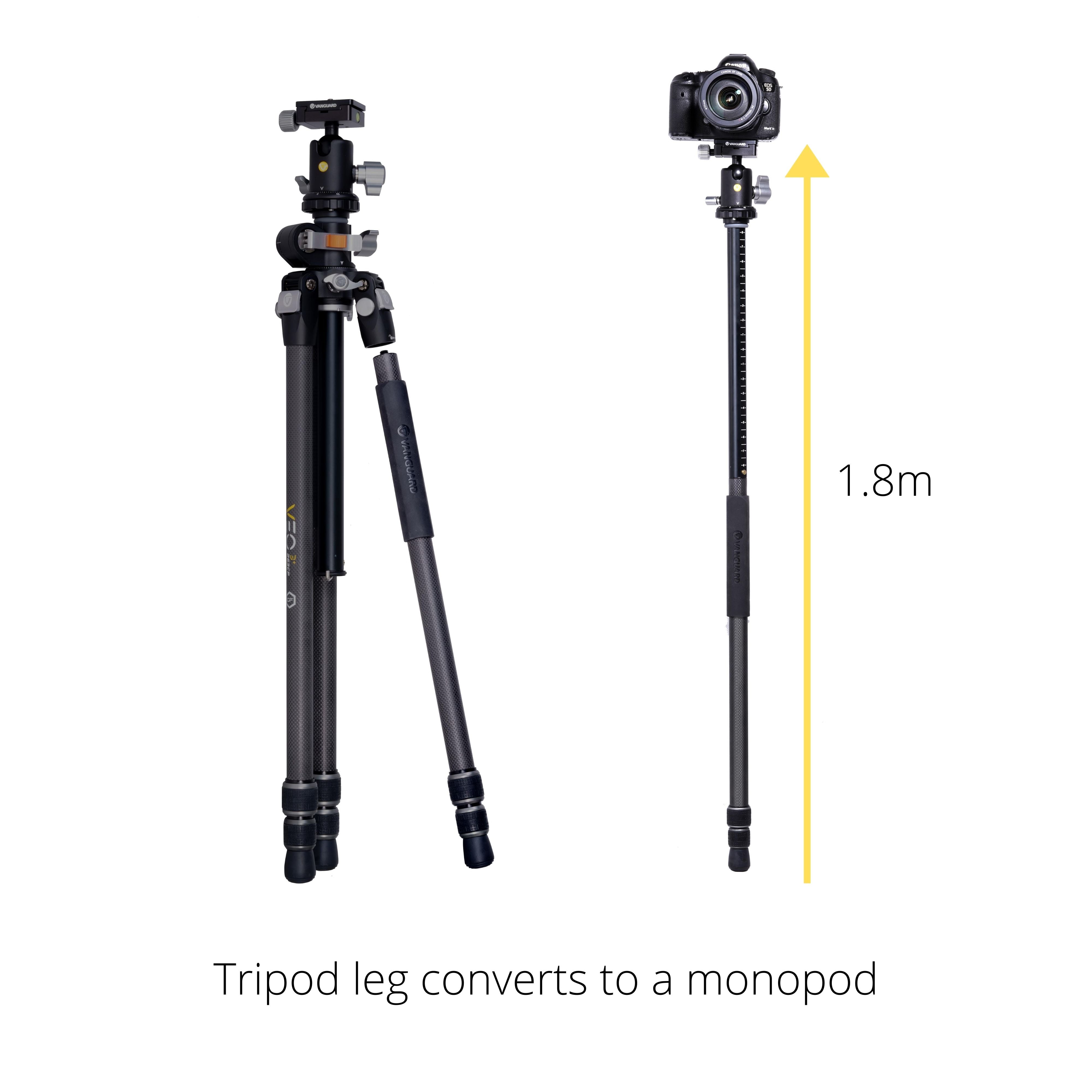 This tripod also features a leg that can be unscrewed to convert into a monopod.  Simply remove the leg and the central column, and screw the two together and you have a monopod that extends to 1825mm.