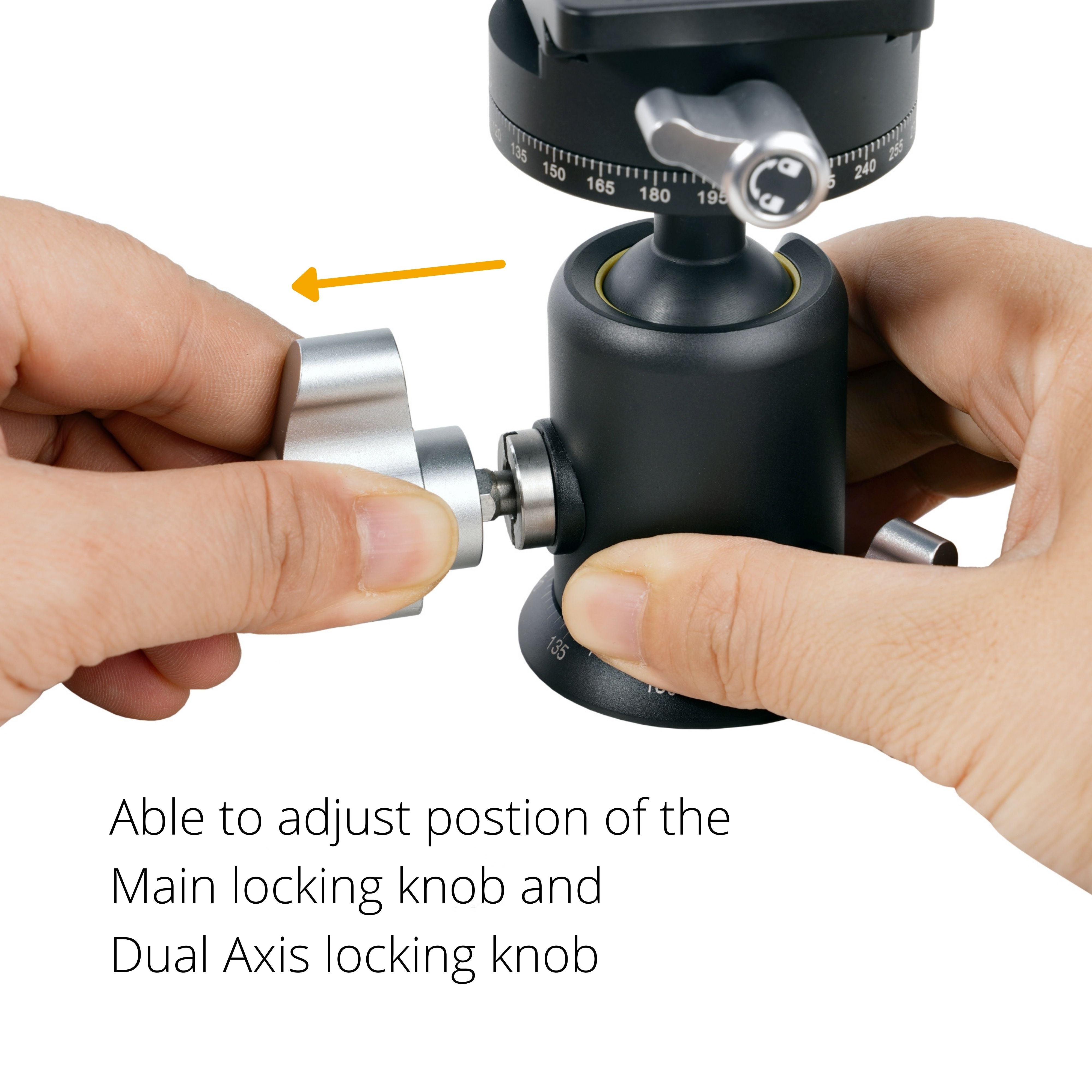 The head includes easy grip locking knobs, and the top pan locking knob and the main ball locking knob can be pulled out and repositioned to more convenient positions, without affecting the solidity of the head.
