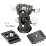 - Arca compatible ball head with removable, anti-slip screws on the base of the quick release plate