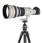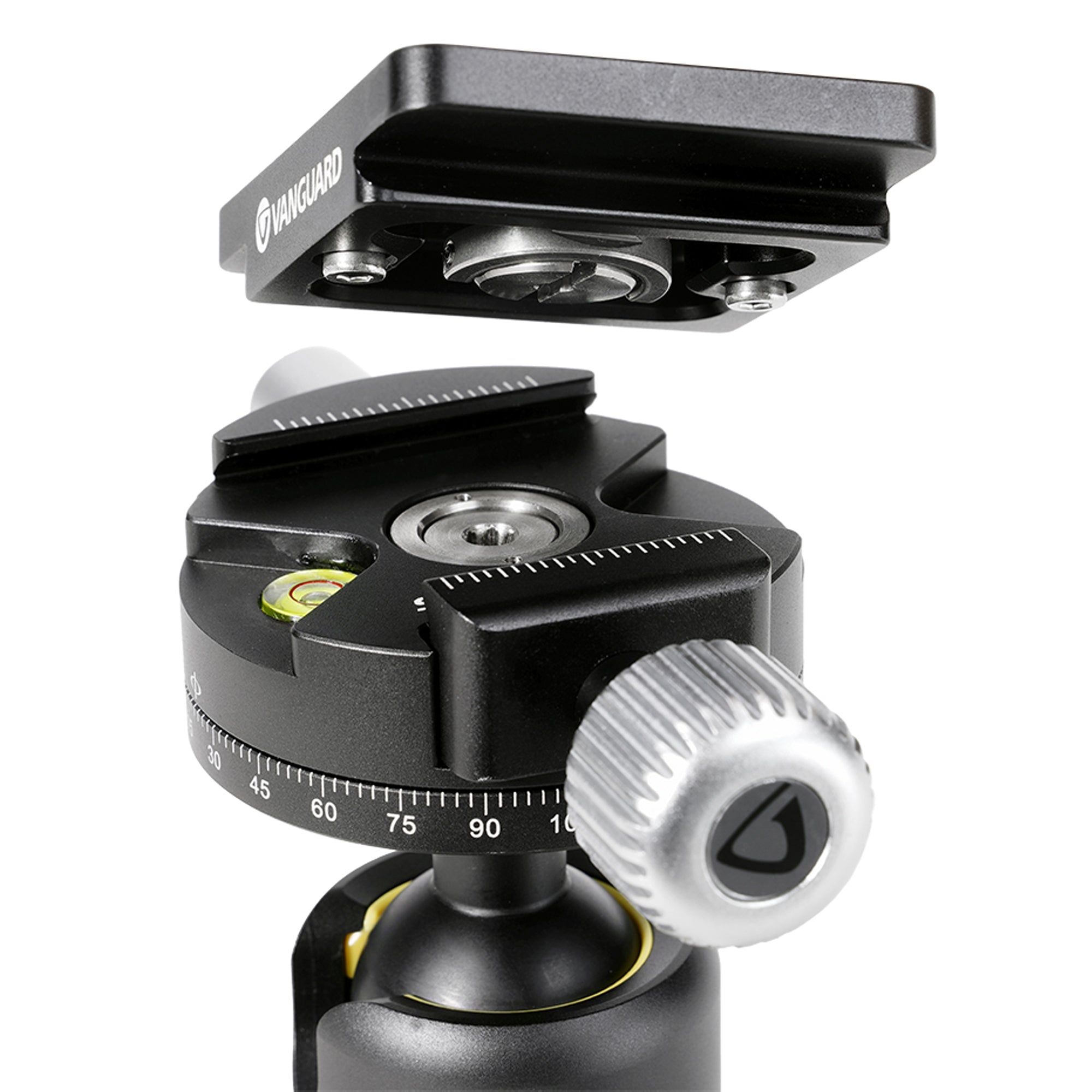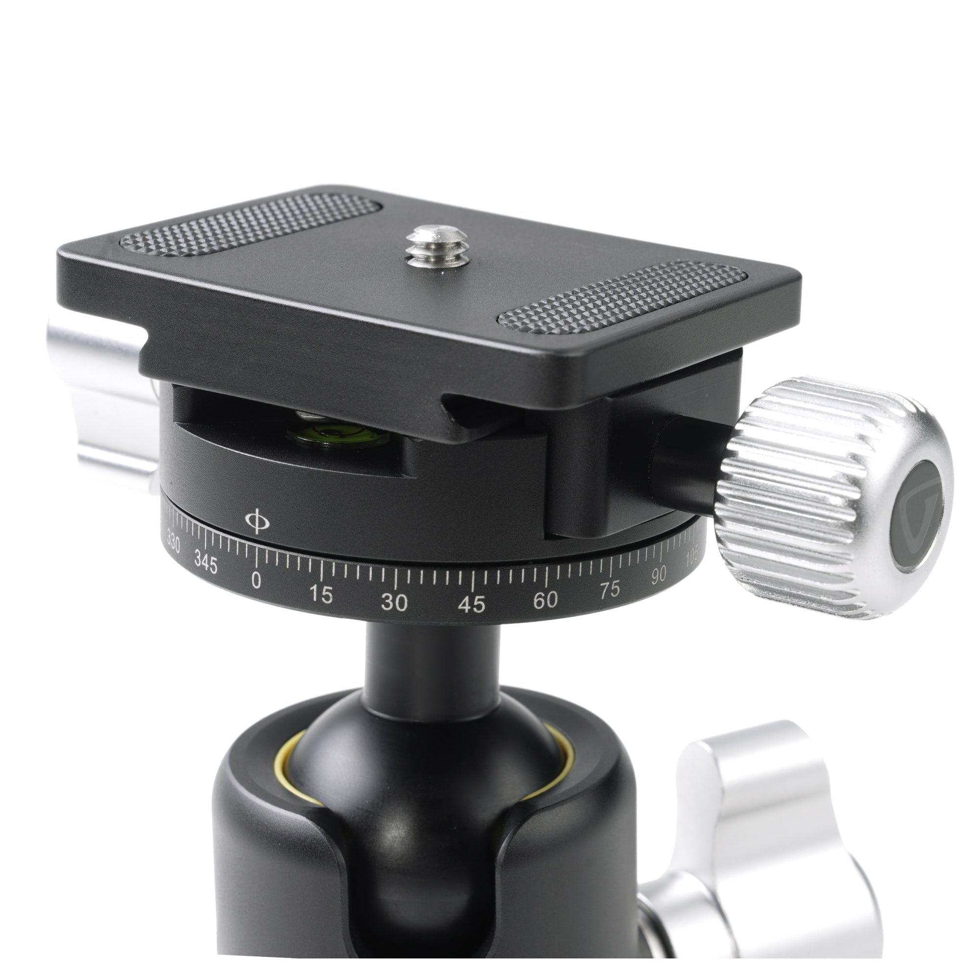 - Two 360° panning knobs, one on the base and the second under the quick release plate