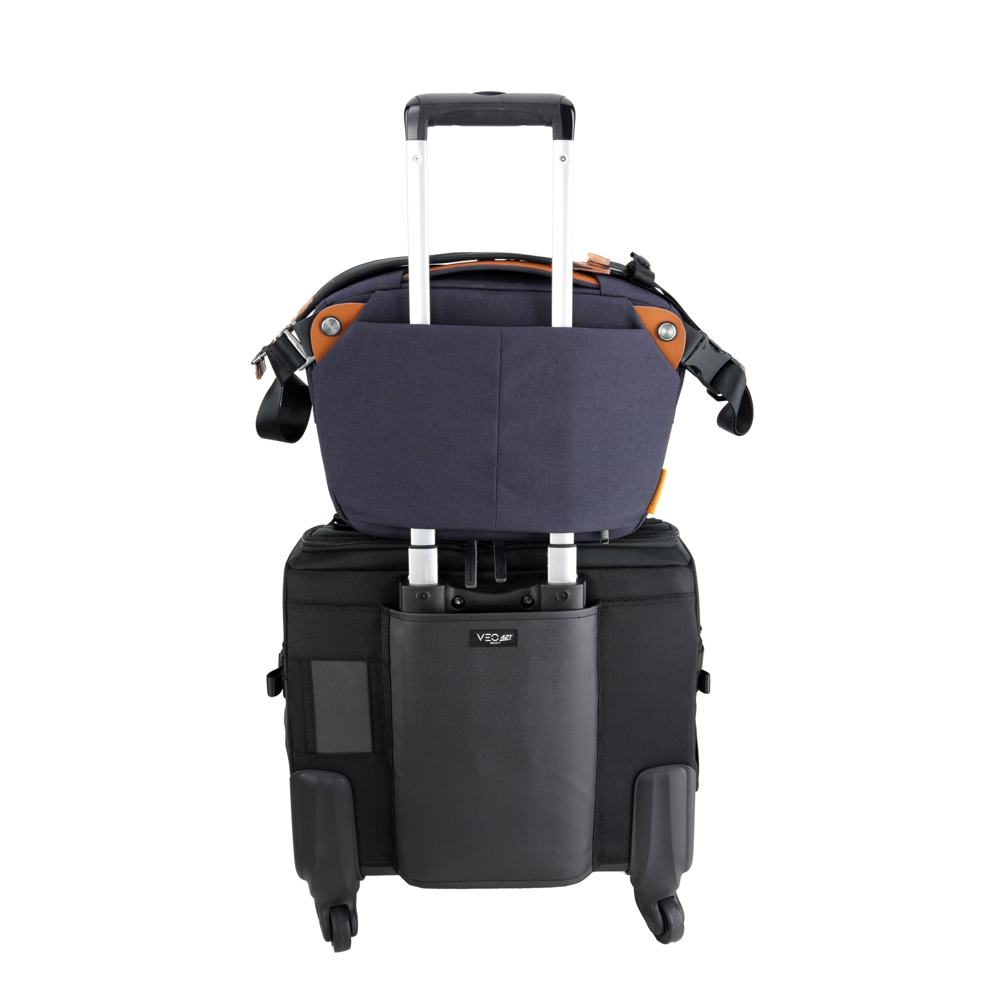 On the base, this bag allows you to attach the straps provided so you can carry a compact travel tripod like the VEO 3T Series (designed for vloggers) or the VEO 3GO Series (designed for maximum portability), or a gimbal on the base of the bag.