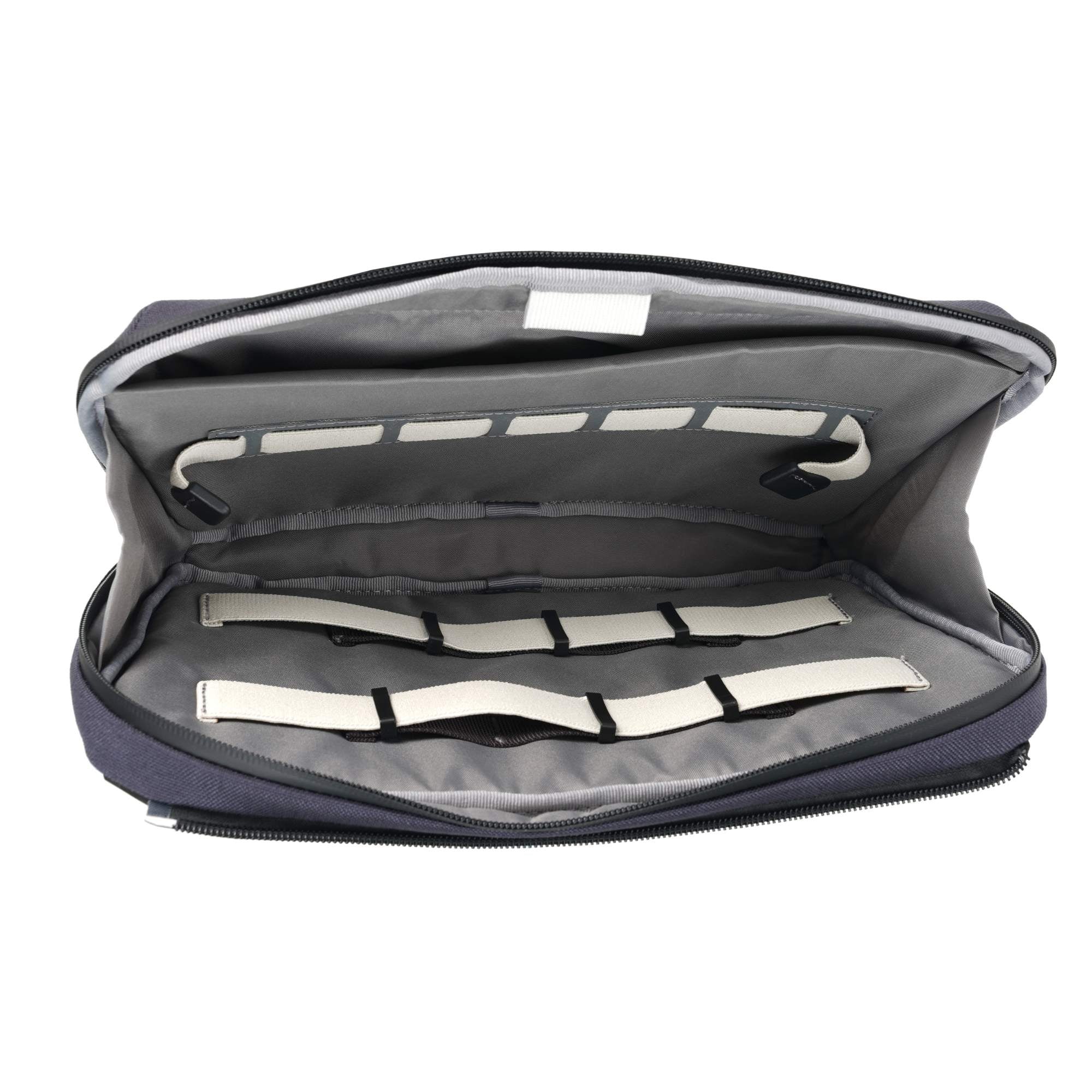The shoulder bag comes with a non-slip neoprene shoulder strap to maximise comfort. This is attached to the bag with a swivel design that ensures the bag fits comfortably to your side as you walk, with a padded back panel to help contour the bag to your body. For longer distances, there is also a detachable cross body strap that helps prevent the shoulder strap slipping on the go.  If not needed, this can be used to become the shoulder strap for the accessories pouch.