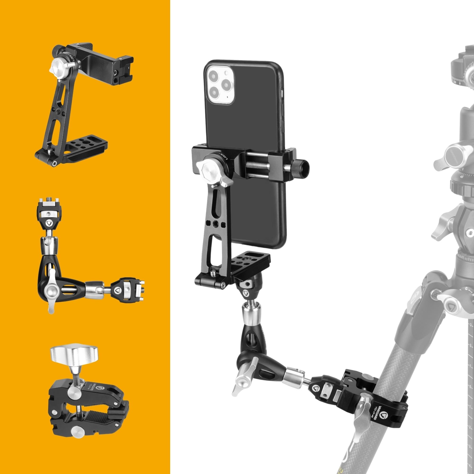 The VEO CP-46 Smartphone Kit brings together a range of complementary CNC machined solid aluminium accessories to form a versatile kit for photographers or smartphonographers, including the VEO CP-46 Clamp, the VEO TSA DLX M Tripod Support Arm and the VEO SPH Smartphone Holder.