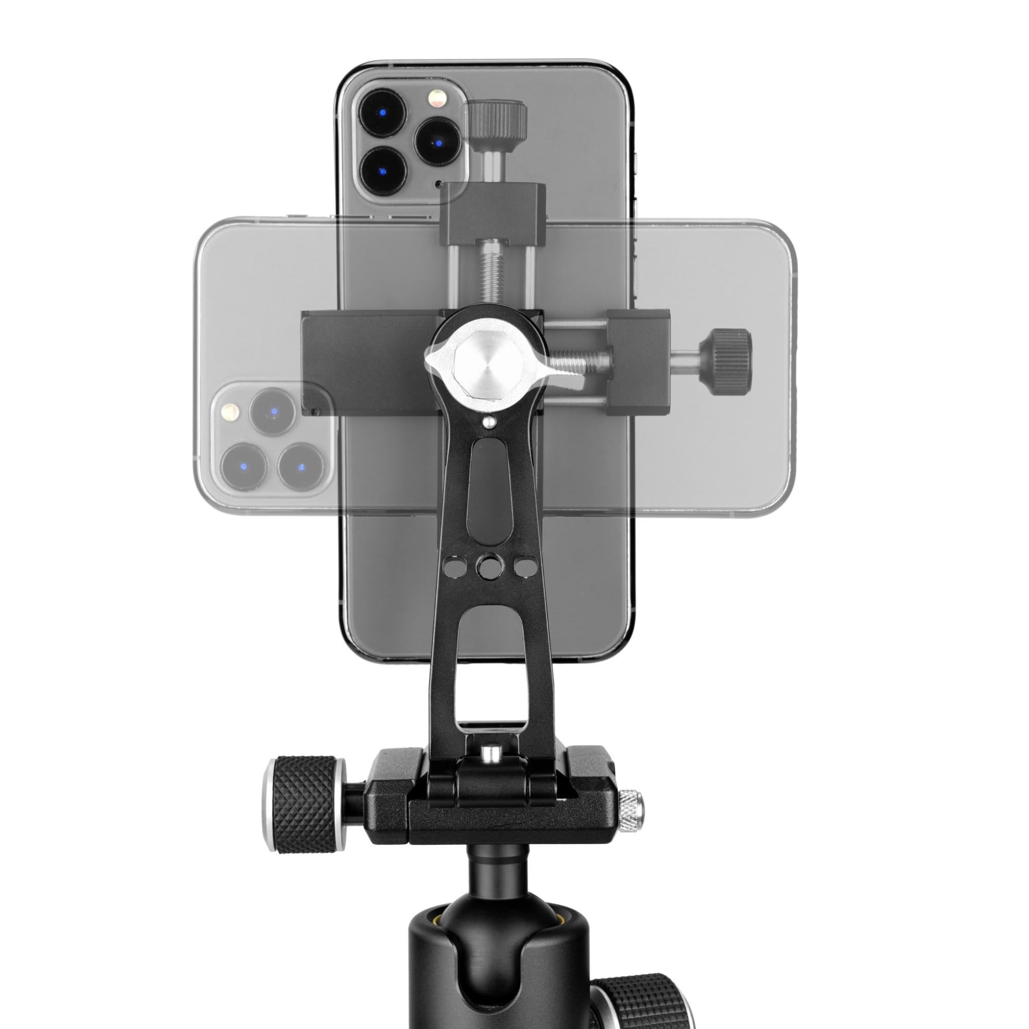 The base smartphone holder is Arca compatible and so can be used on any suitable head, and includes a choice of 1/4" and 3/8" threads, so it can be attached directly to any tripod or monocular.