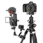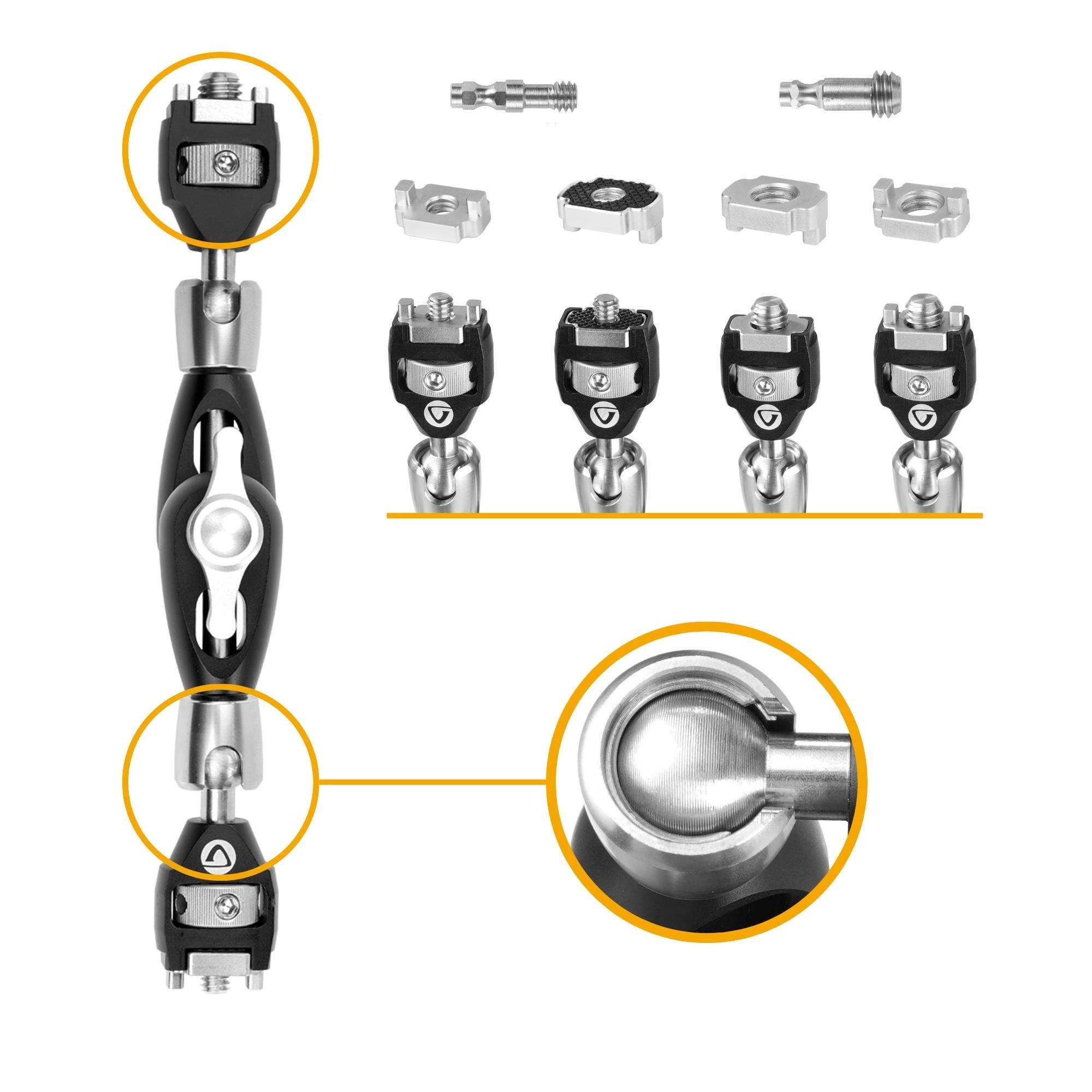 On the clamp body, there are three threaded holes, two 1/4" and one 3/8". These allow you to attach up to three tripod support arms for a camera, Go Pro, smartphone, lighting or a microphone, each positioned independently. This makes it perfect for attaching the VEO TSA DLX M Tripod Support Arm. This solid aluminium support arm is controlled through the single locking knob which is oversized for easy grip. Loosening the locking knob loosens the support arm serrated angle joint and the ball joints on either end, allowing you to position the arm with ease, and lock up with one hand.