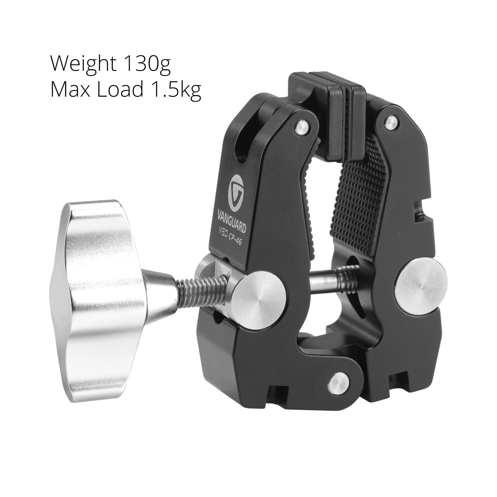 VEO CP-46 Clamp: Can attach to almost any object up to a 46mm diameter with a moulded rubber inner lining for maximum grip, and three threaded holes (two 1/4" and one 3/8") for attaching tripod support arms. Weighs 130g with a maximum load capacity 1.5kg