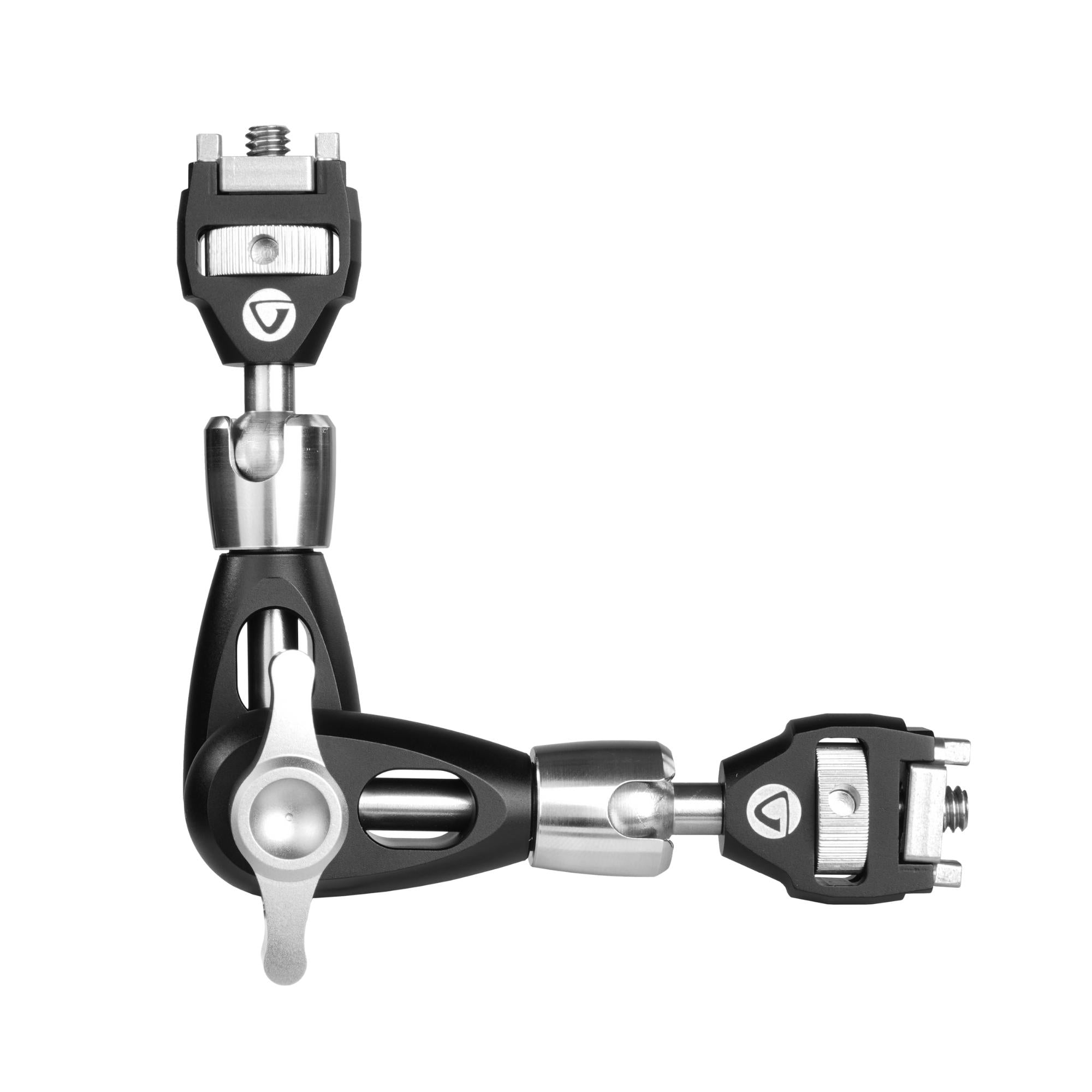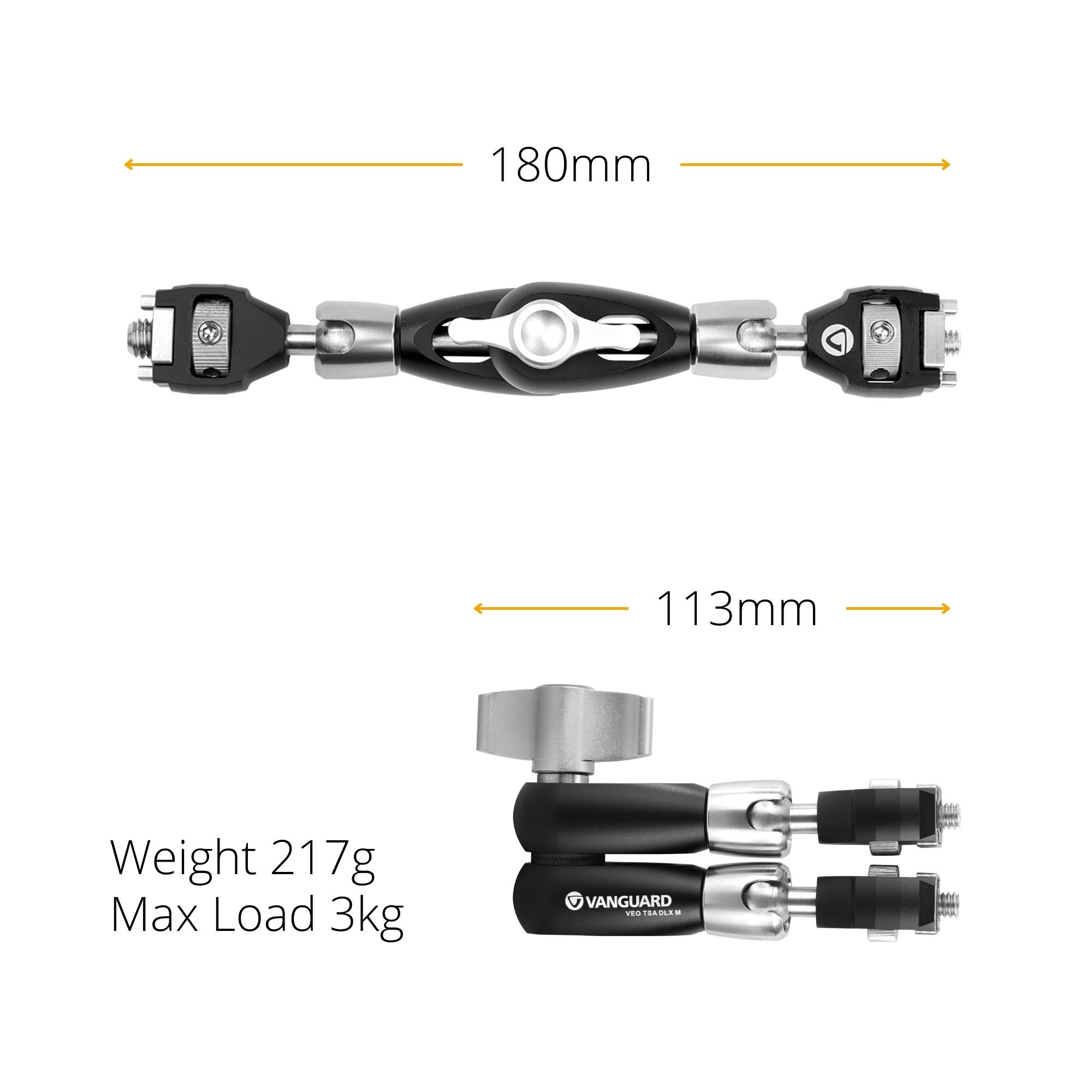 VEO TSA DLX M Tripod Support Arm: Folds to 113mm and extends to 180mm with a serrated steel elbow joint for solid grip and ball joints at either end for maximum control. Weighs 217g with a maximum load capacity 3kg