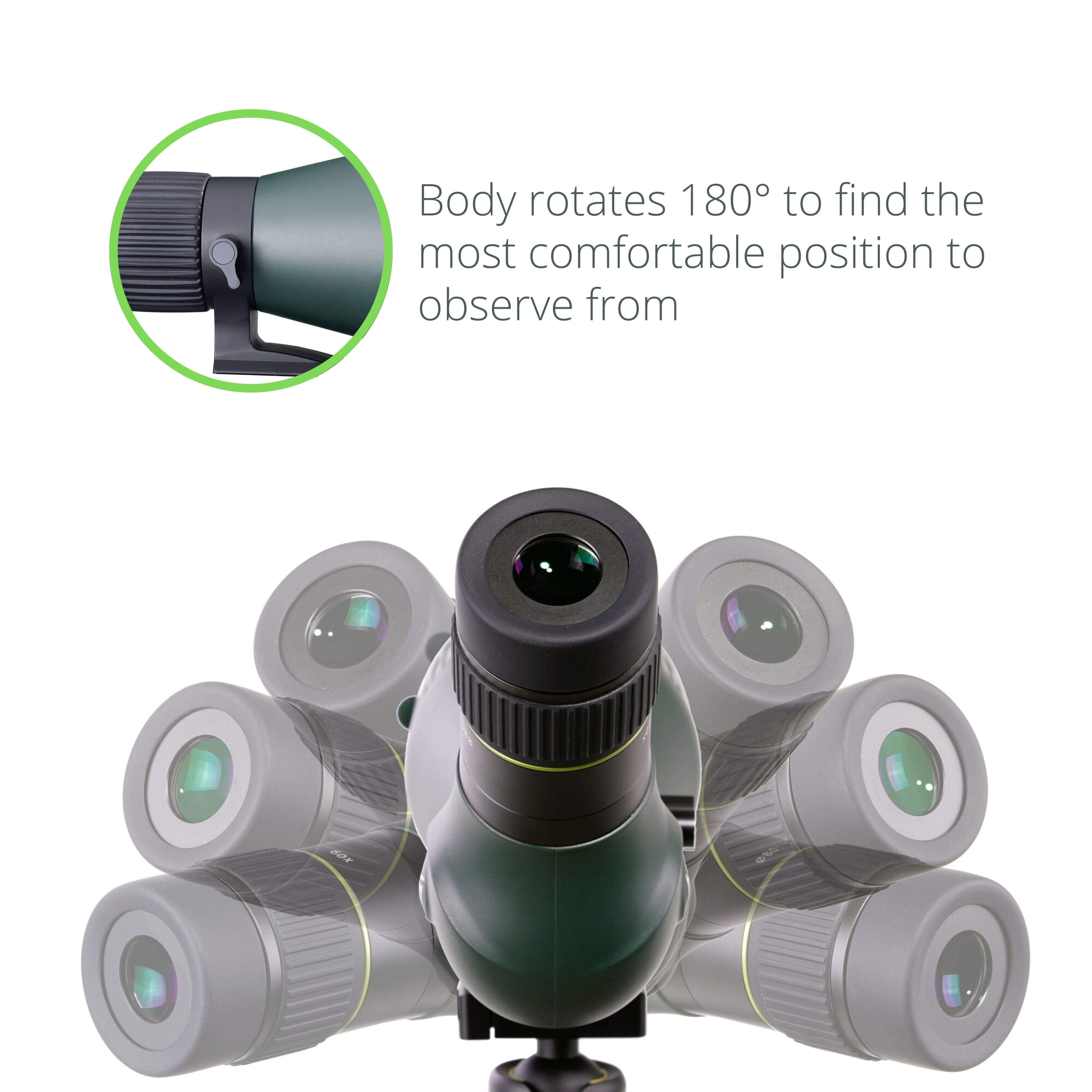 The VEO HD 80 includes a 80mm objective lens with a 20-60x zoom on the angled eyepiece and a large, easy grip central focus adjustment wheel on the body.