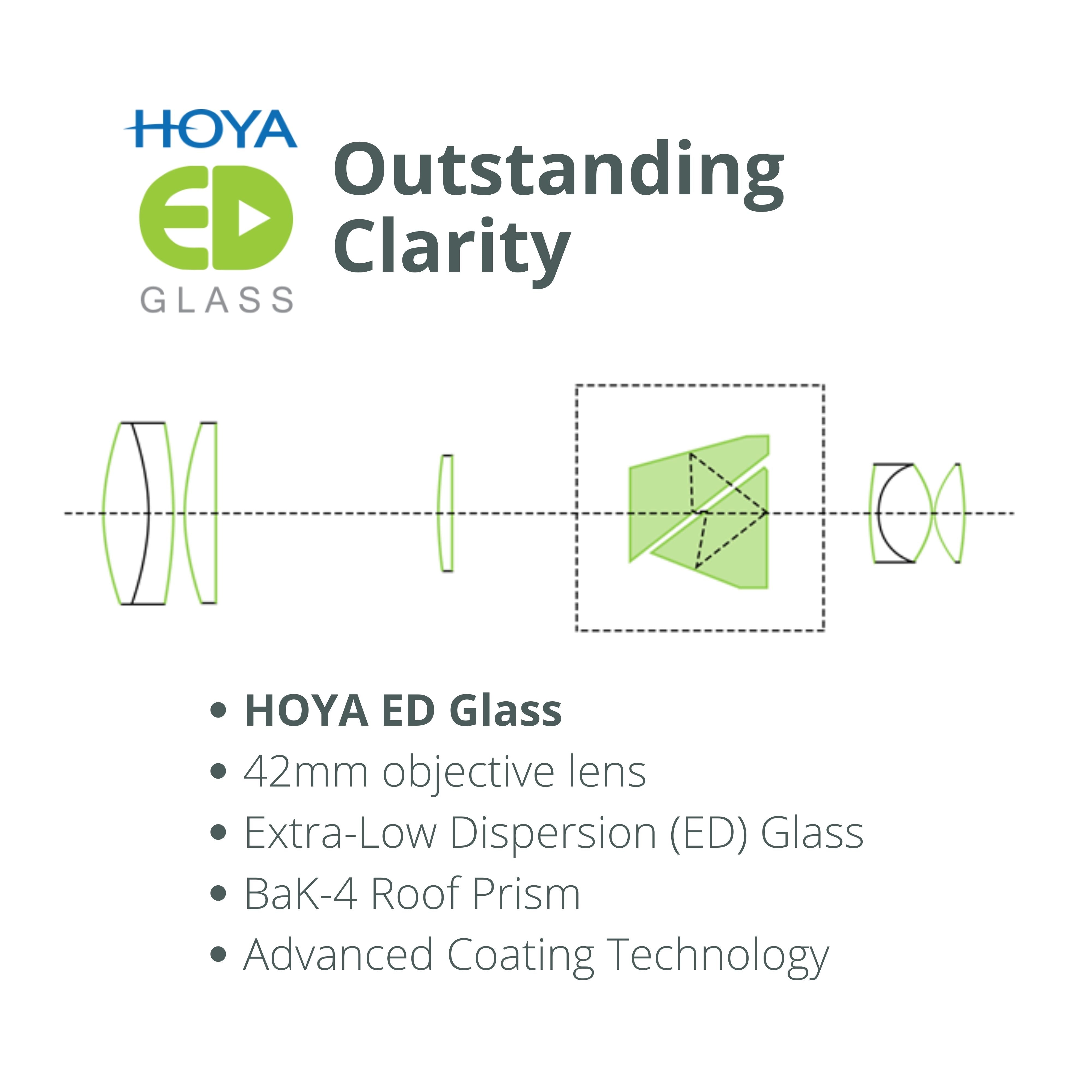 - HOYA Extra-Low Dispersion (ED) Glass and BaK4 roof prism that is fully multi-coated with Multiguard® 7