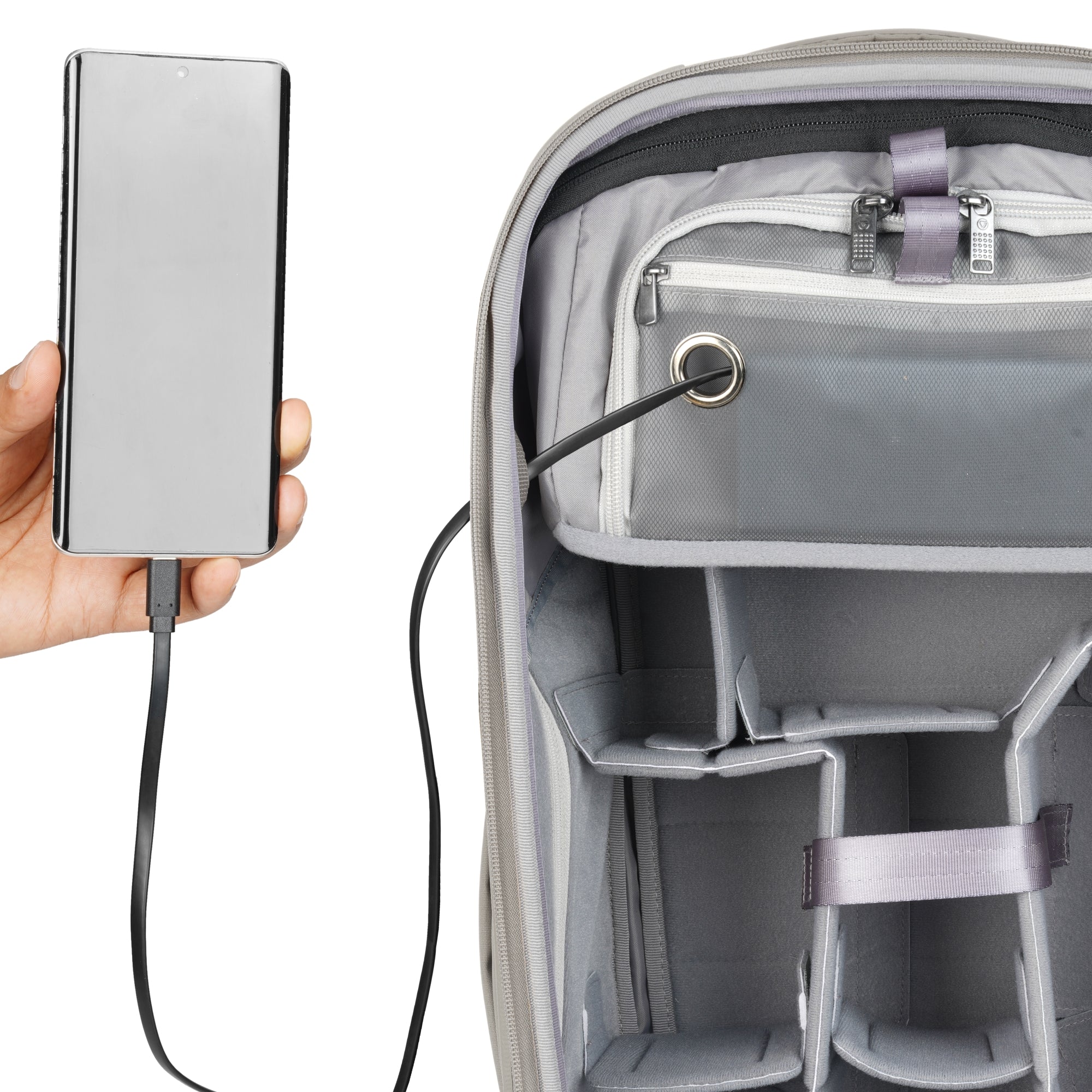 The upper daypack compartment allows you to carry everyday items to make the most of your day, or additional camera kit. It is 280mm wide, by 160mm tall, with a maximum depth of 135-150mm, but due to the shape of the bag this tapers off towards the top. This includes a compartment on the rear of the compartment for a power bank, with slots allowing you to take a cable to the device in your hand for power on the go. Access to the compartment is through the top of the bag, but it is also designed for fast access from the rear of the bag. This daypack compartment can also be removed, allowing you to set up the backpack for top access to your camera.