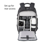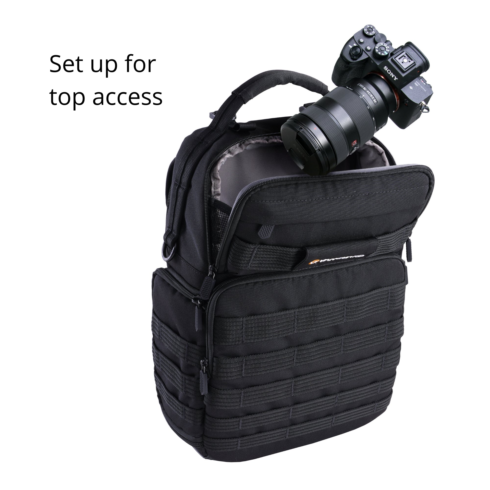 You can decide the best access for you. Full access to your camera and lenses is from the rear for maximum security on the go. Fully opened, this allows you to tailor the interior to your needs. For fast access to your camera on the go, it comes set up for quick side access. You can also remove the daypack compartment and setup the backpack for top front access.