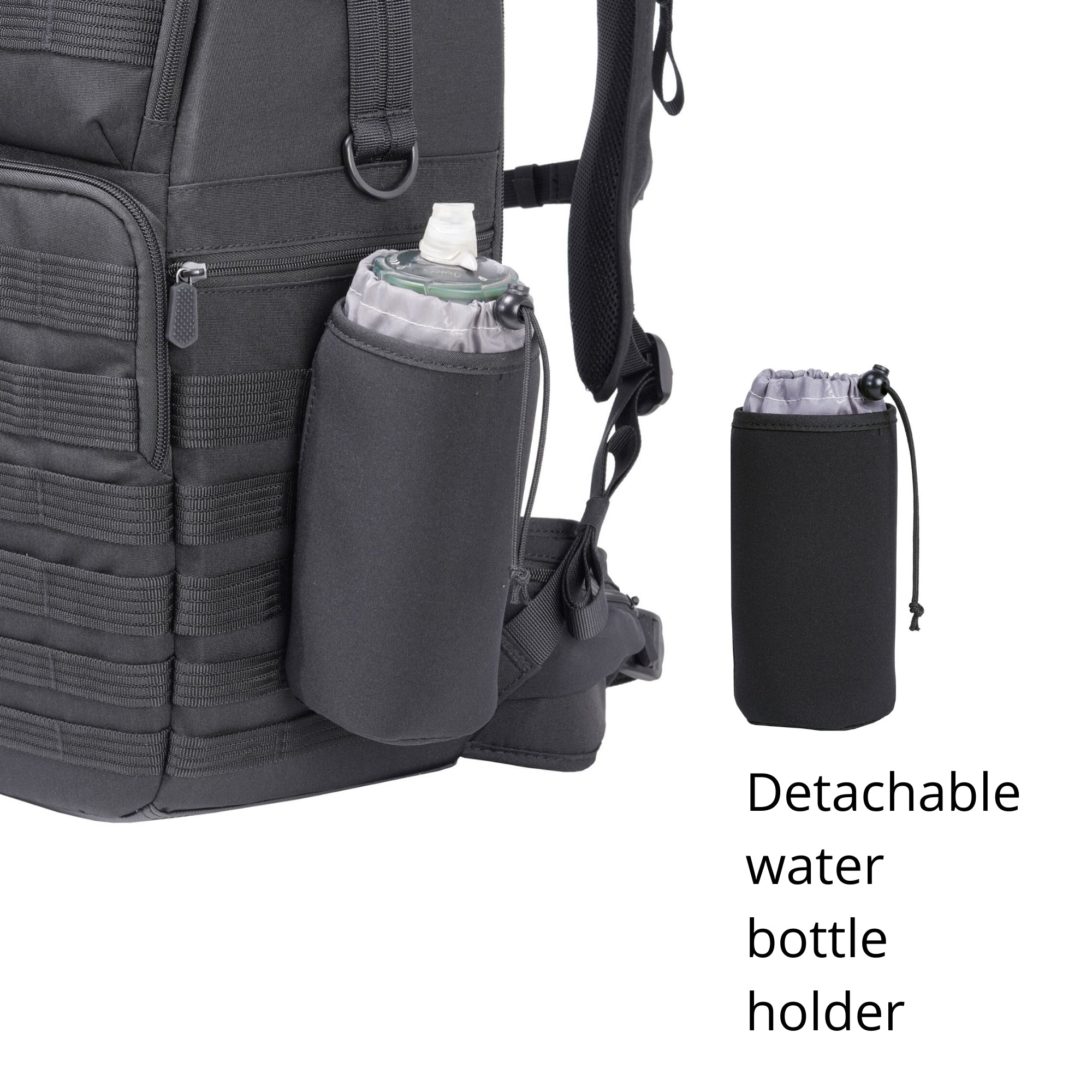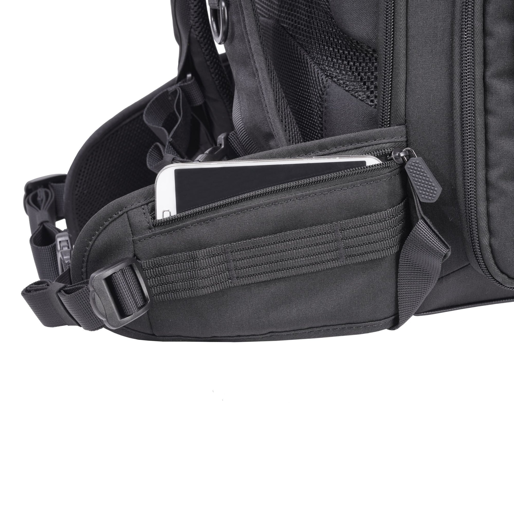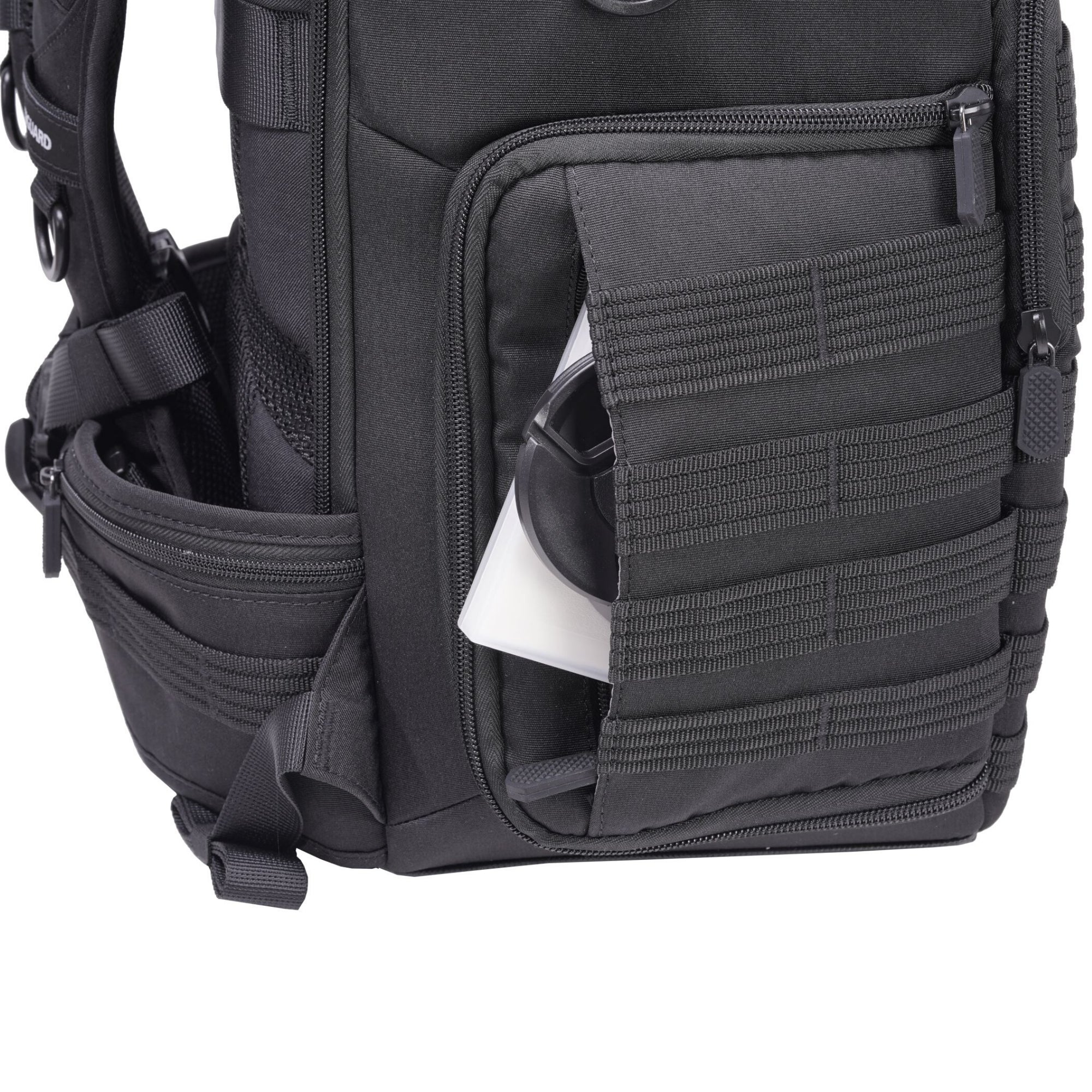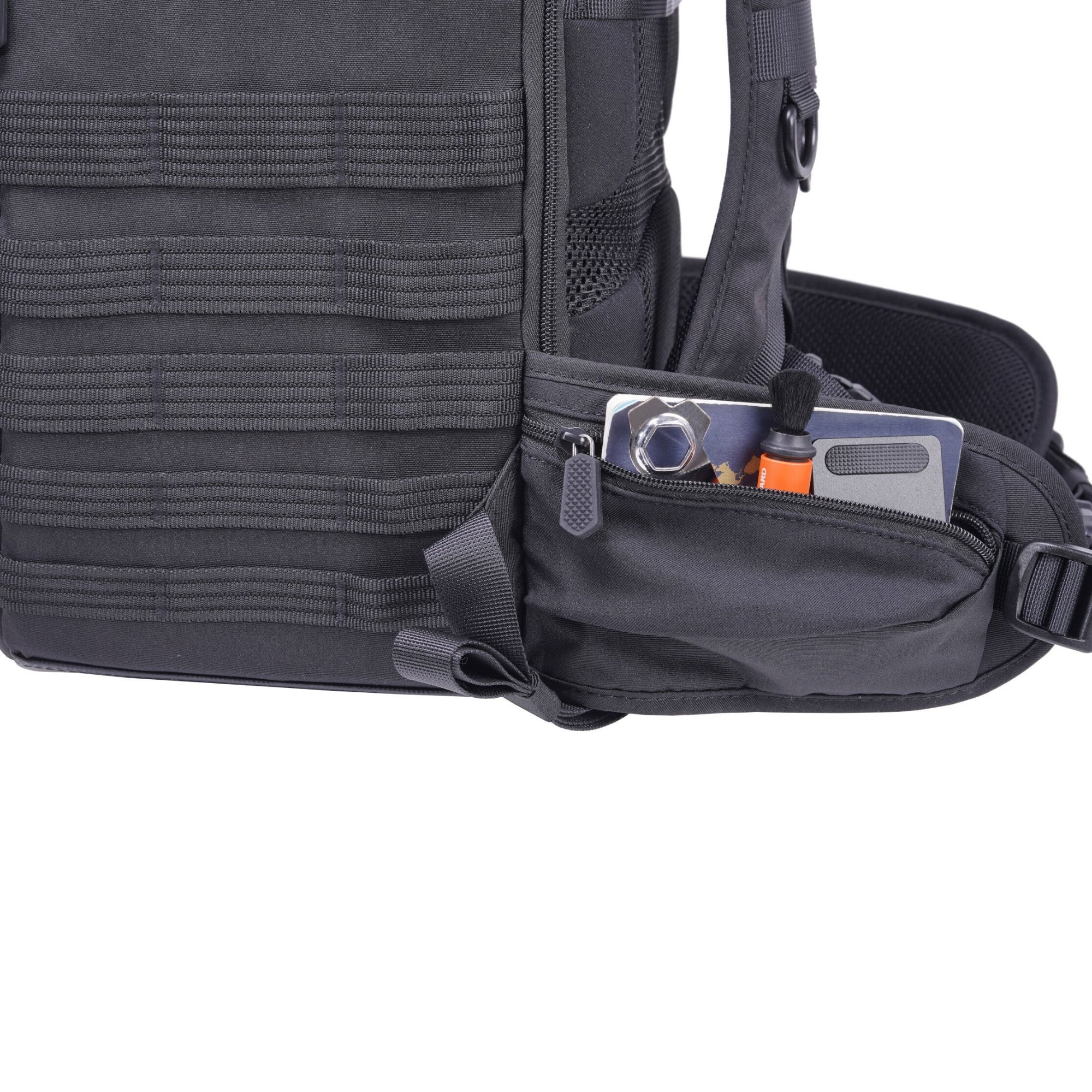 In addition to the versatile interior, the exterior has multiple webbing straps on the front and sides that can be used to attach other accessories. For example, you can attach the tripod foot pocket that comes as standard and, when used with the upper straps provided, which allows you to carry a tripod on the side, or on the front for better balance. This backpack also comes with a detachable bottle holder that can be attached to the webbing when needed for longer trips.