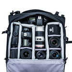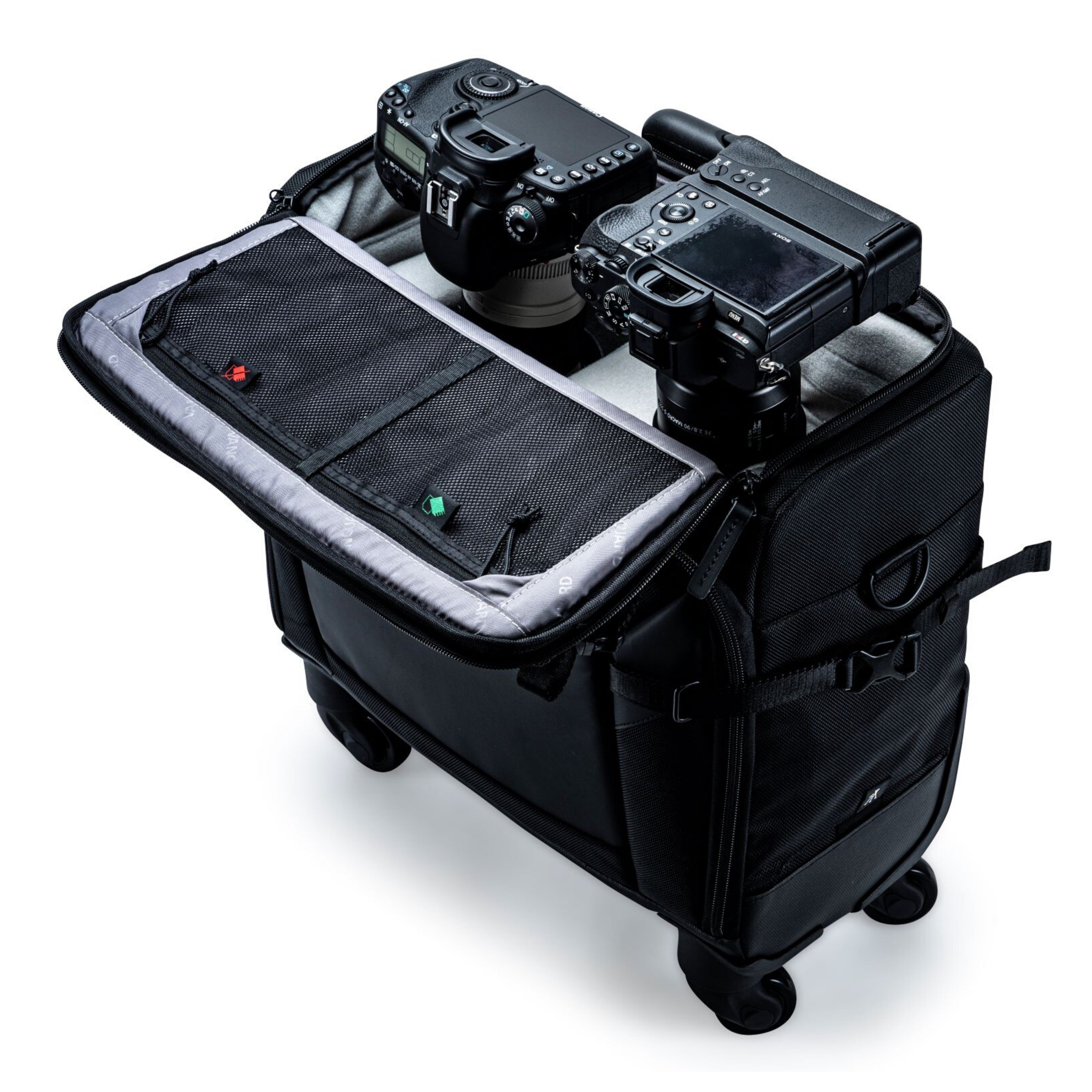 It’s customisable 370 × 160 × 330mm (14 5/8 × 6 1/4 × 13 inches) interior will allow you to fit a pro level of kit that includes 1-2 pro DSLR/mirrorless cameras with a grip, 7-8 extra lenses (up to 300mm f/2.8), a flash unit, a 16" Macbook Pro with a 9.7” tablet and multiple accessories such as memory cards, cables, batteries and a charger. Your kit can then be accessed fast through the top, or through the front panel. Alternatively the interior can be removed, allowing you to use it as everyday luggage.