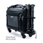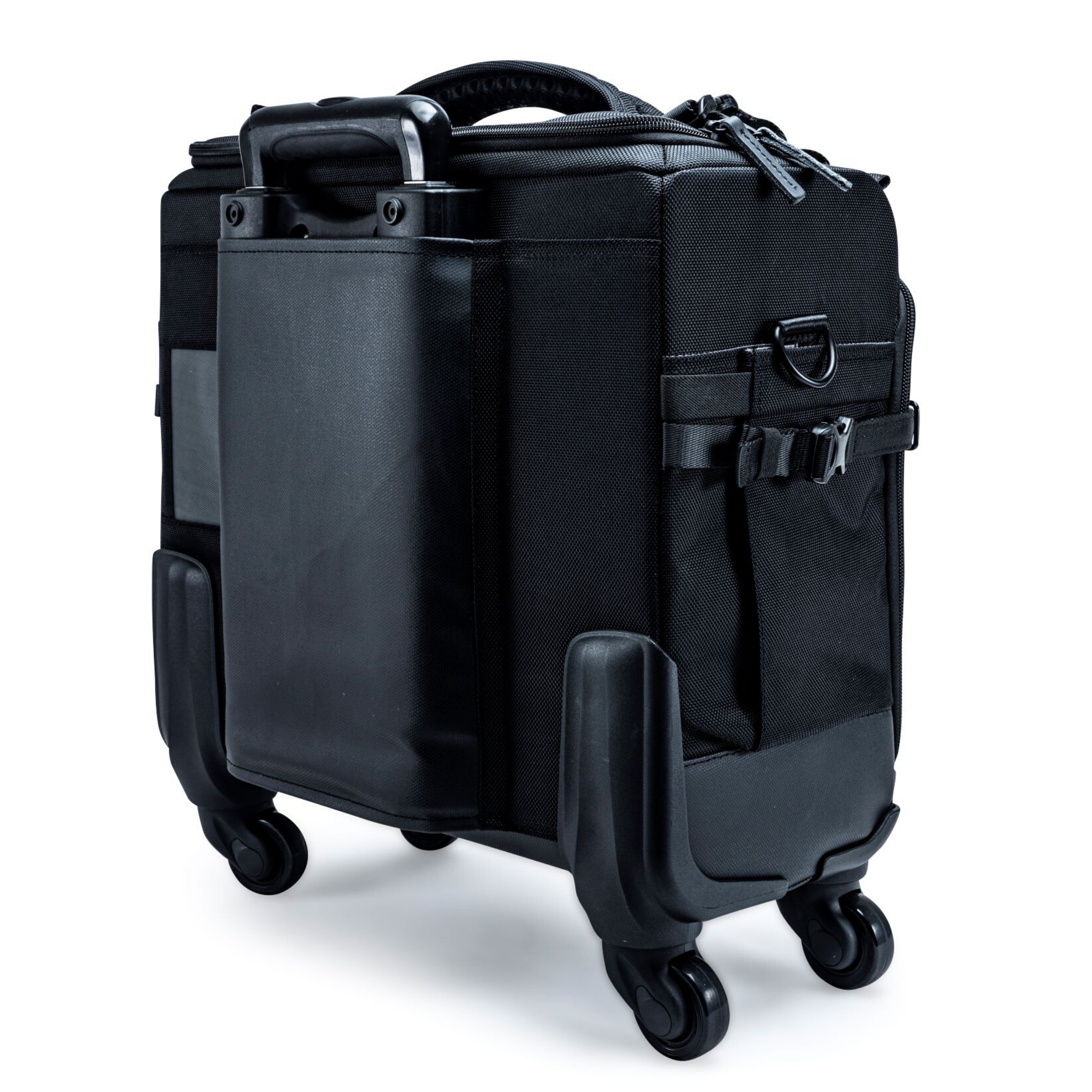 It will also fit up to two tripods. The main tripod pocket is discretely tucked away on the side when not needed, but can then be set up in seconds for most tripods. The second travel tripod (or monopod or lighting stand) can be attached to the straps provided on the top of this roller bag.