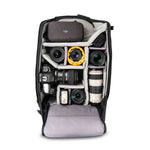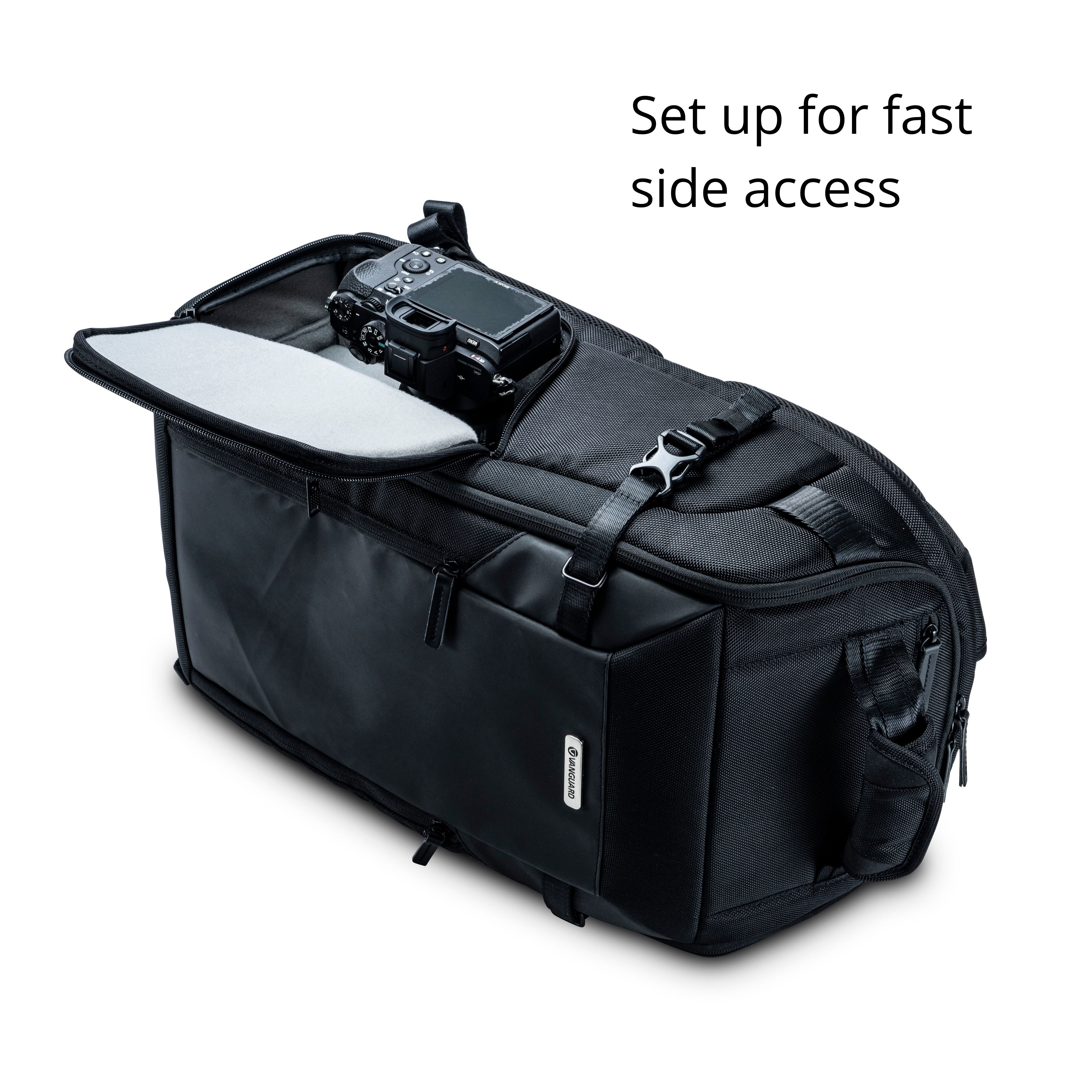 This backpack can be set up to take advantage of the multiple access points. Full access to camera and lenses is through the front of the backpack, with security straps that double up to allow you just to access the daypack section, rather than opening the full backpack. Alternatively removing the daypack base and you can set it up for fast, top access to your camera, or there is fast side access to your camera.