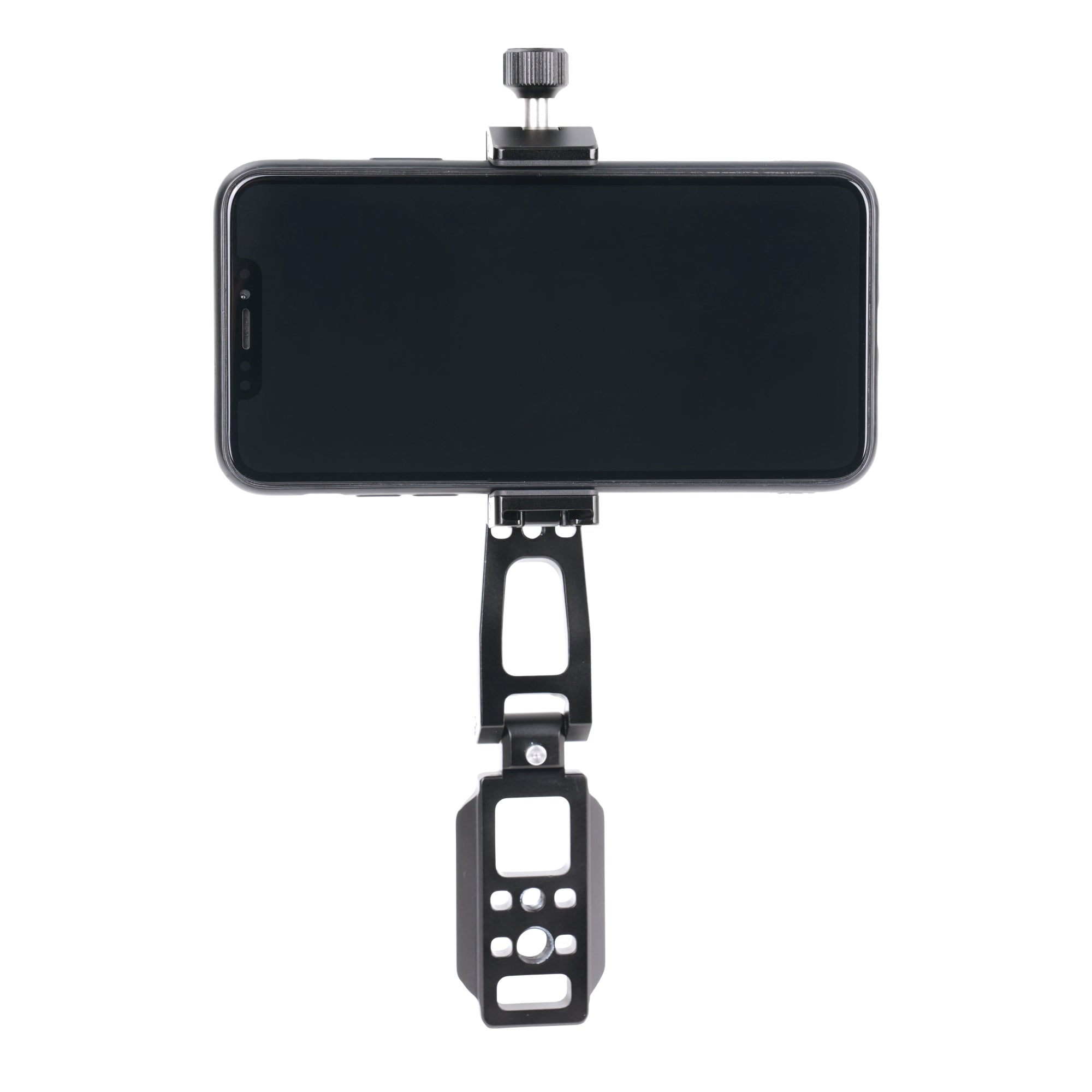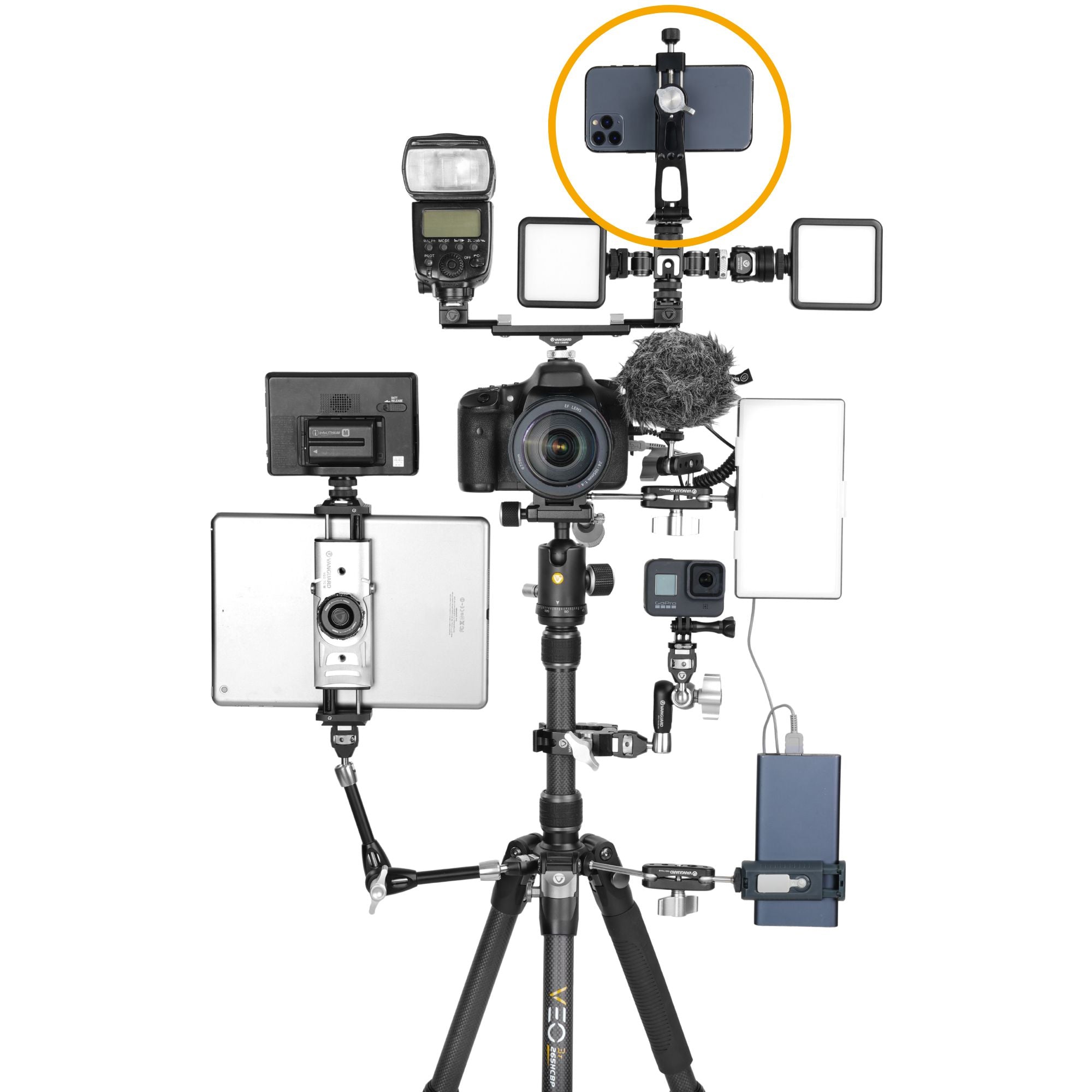On the top of the smartphone clamp is a cold shoe mount that allows you to attach an accessory such as a microphone or light directly, or using a VEO CSM or VEO CSM DLX. Alternatively, if you want to add additional accessories, you can with one of our VEO CSMM Multi-Mounts.