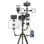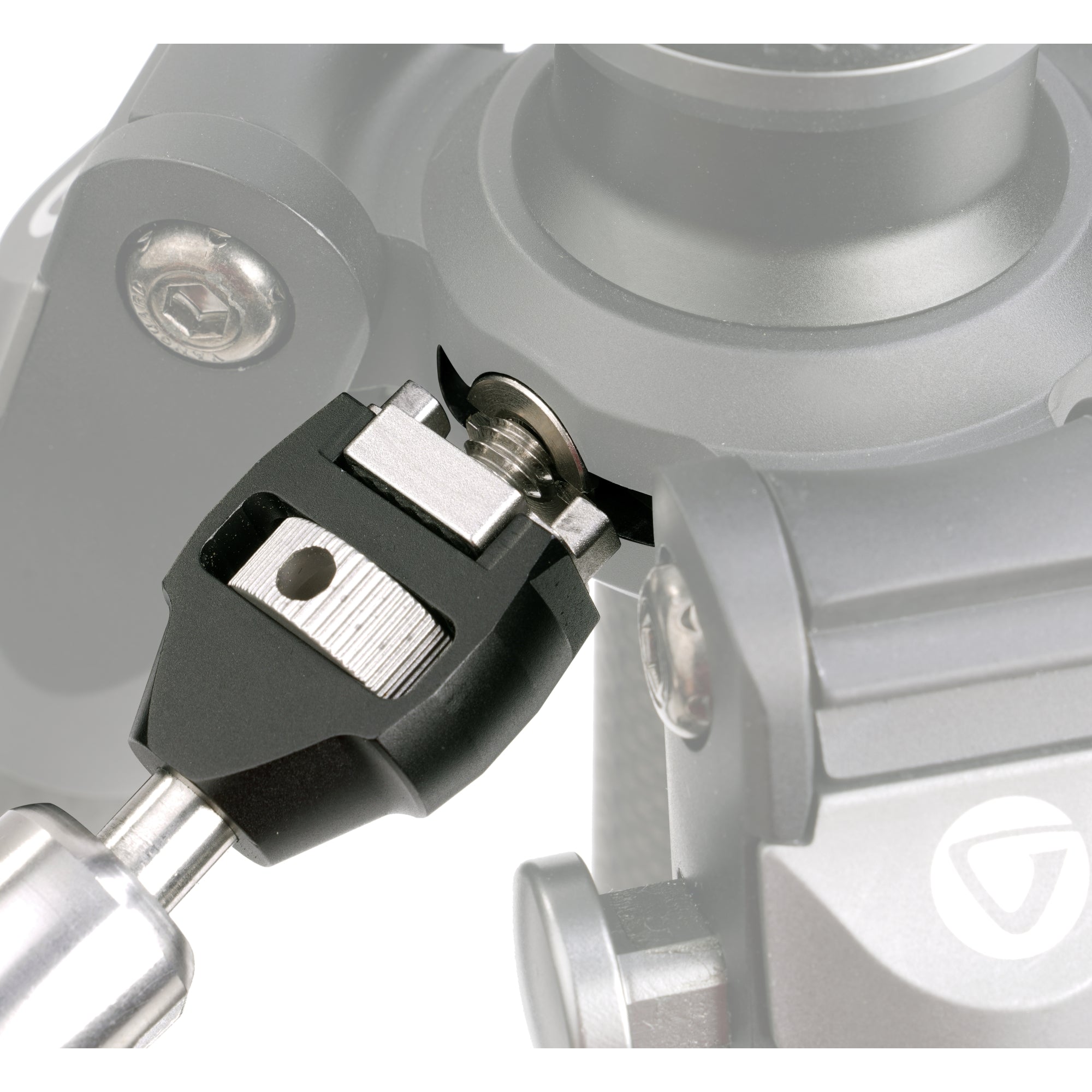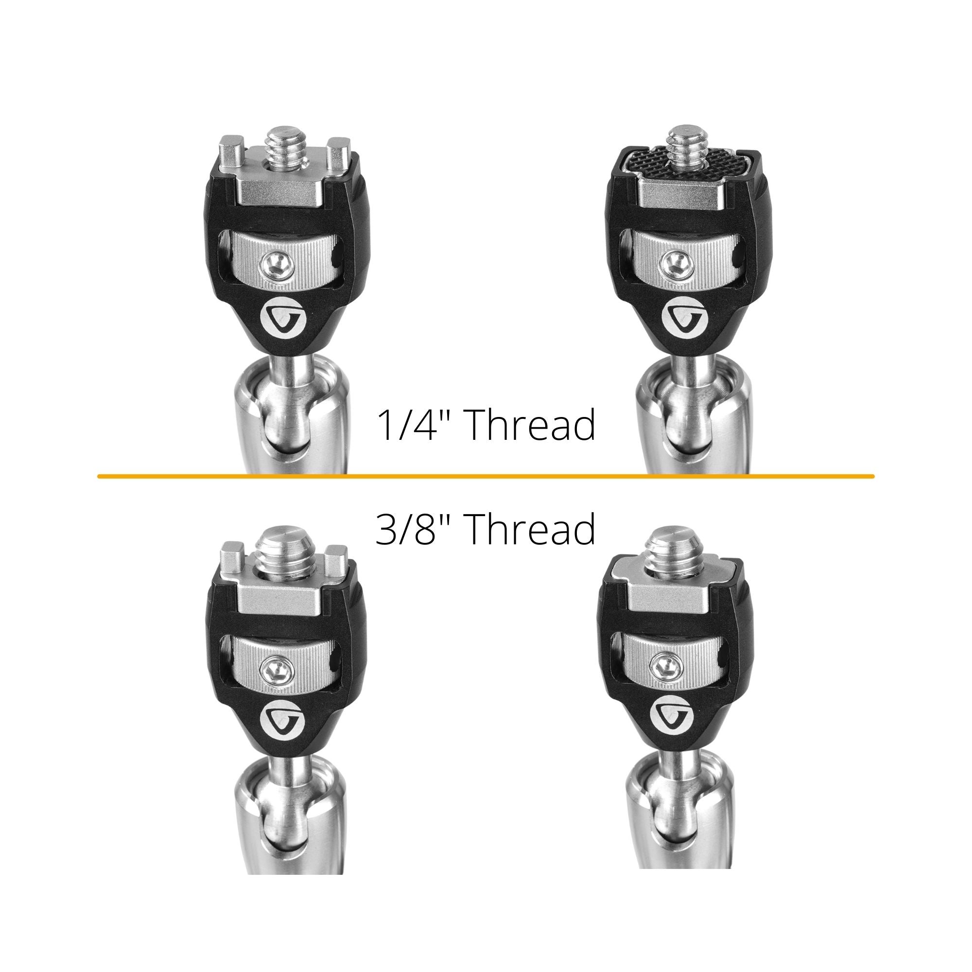 To attach to the accessory of your choice there is a 1/4" thread that can screw directly into selected accessories, or it can screw into one of Vanguard's cold shoe mount accessories to attach a wider range of accessories, or the VEO TC tablet connector.